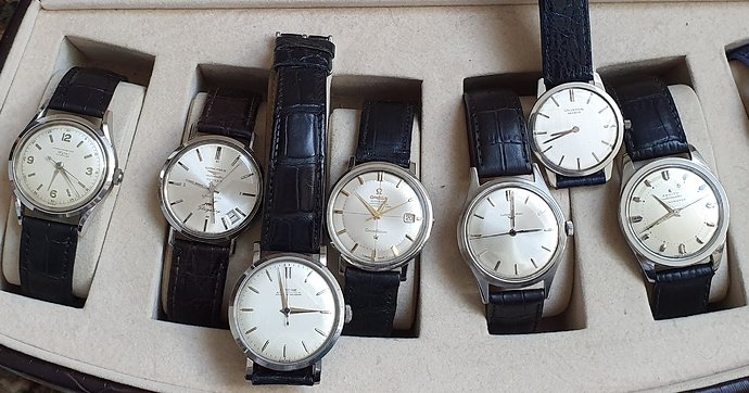Oh de meest linker is misschien wel de meest interessante, een Wyler chronometer, door ETA gemaakt uurwerk met allerlei bijzondere upgrades en een balans die helemaal bizar is. Monococque kast, dus ik kan helaas geen foto’s maken…