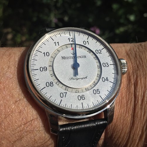 Vandaag bij een Juwelier de Meistersinger Perigraph gepast en ik ben verliefd! Ik kende het merk wel. Heb namelijk de wandklok thuis maar ik had me er nooit echt goed in verdiept. Daarnaast hoor je ook niet heel veel over Meistersinger op dit forum. Het horloge is ruim onder mijn budget zodat ik eventueel nog geld over heb voor een mooie band met vlindersluiting.