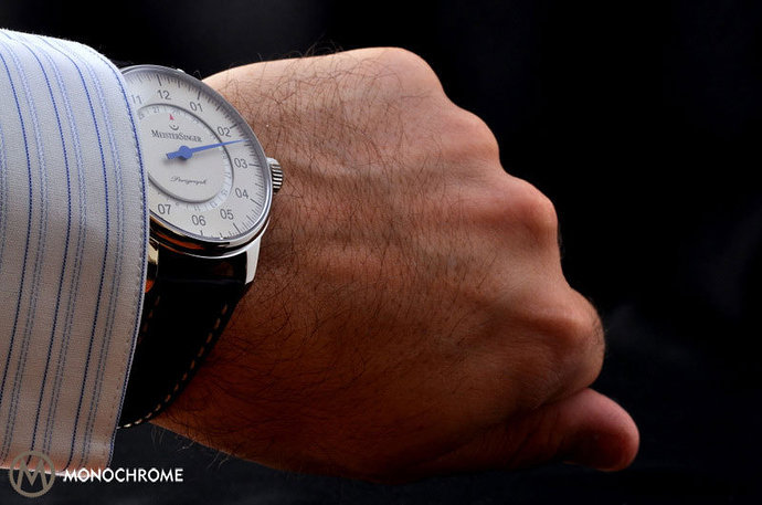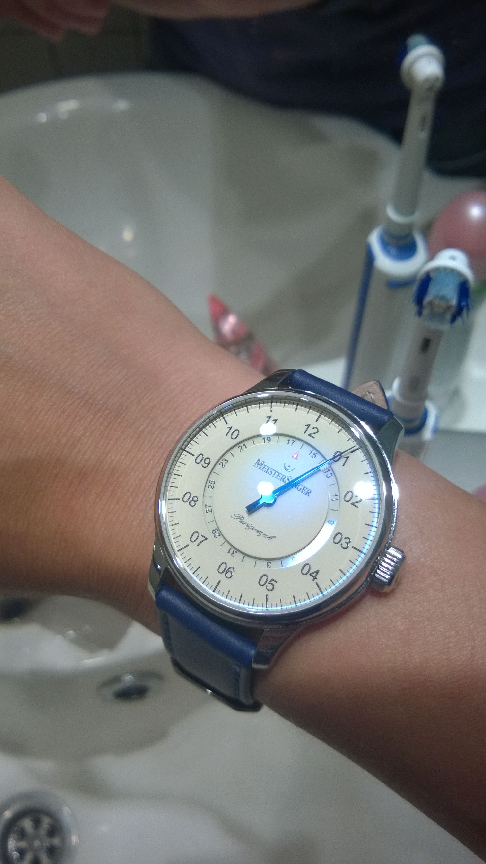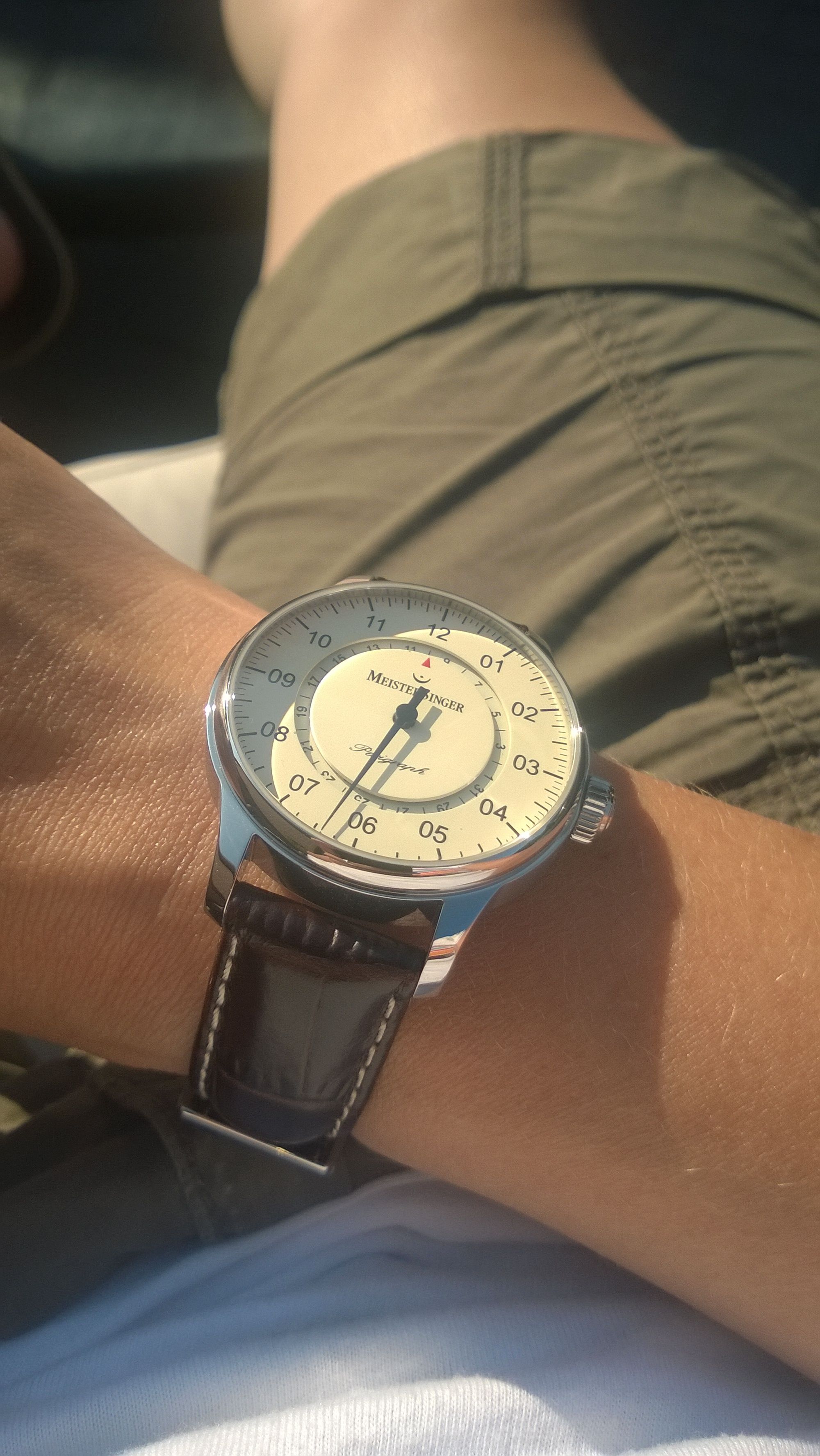 Hier ook de meistersinger met de crème dial. Ik heb ook erg getwijfeld tussen de crème en de antraciet. Maar idd wat je zegt: De blauwe wijzer is heel gaaf!