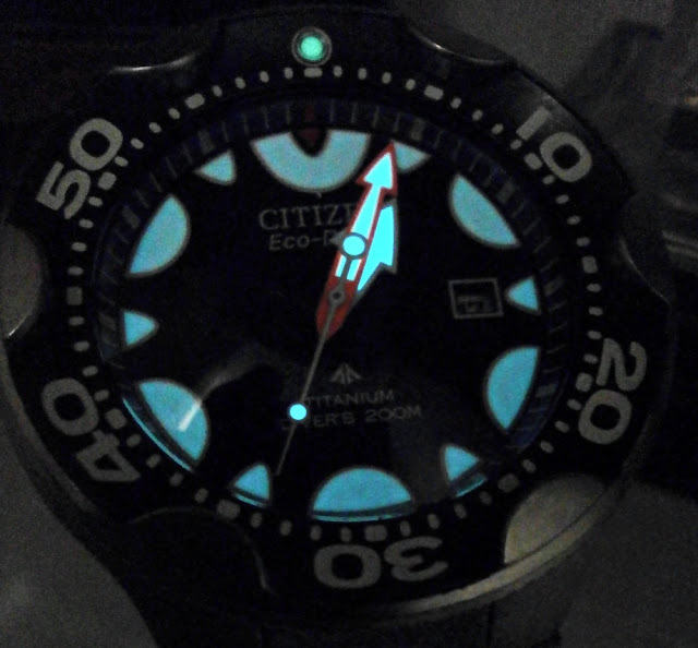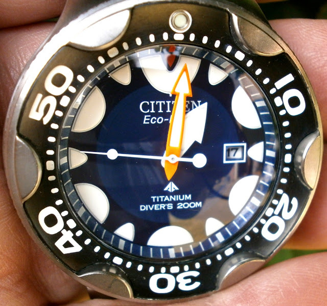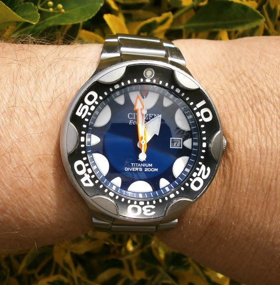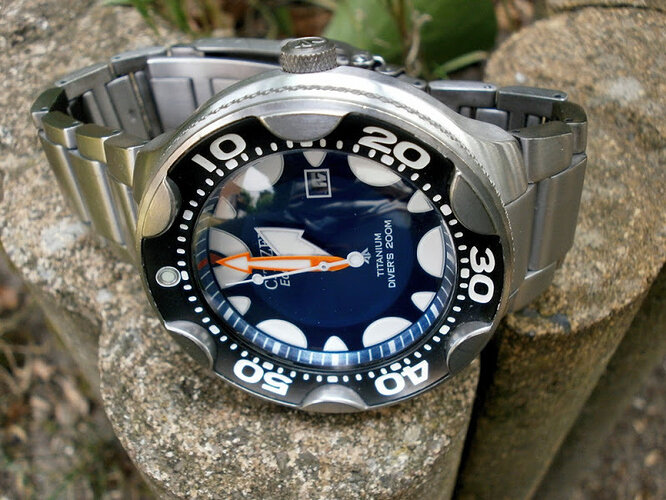 Ik kreeg dit horloge al op de 18e binnen, maar ik ben er vrij zeker van, dat ik er een “steal” aan had. Ik mag altijd graag kijken, of er nog leuke Citizen Eco-Drives op eBay staan. Over het algemeen, spreken de meeste mij daarvan niet aan, een enkele wel en ben in middels in het bezit van 4 leuke modellen. Toen ik opeens deze Citizen Orca tegenkwam MET de originele titanium armband! Gekeken/gezocht op internationale fora, schijnt dat de beste toevoeging te zijn, gezien de rubber band nogal plakkerig is met warm weer en het nogal stof en zo ‘aanhangt’.