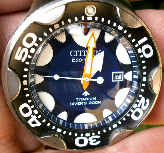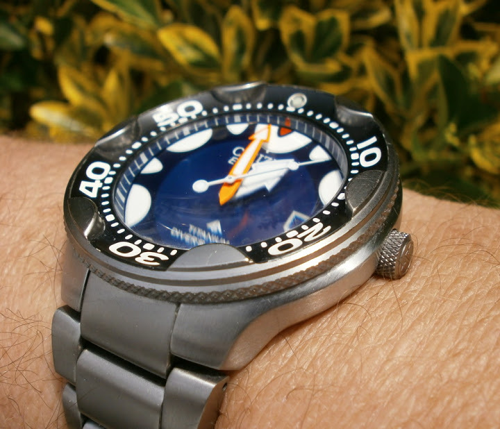 Tja, ontzèttende mazzel gehad, zullen we maar zeggen! Ik weet niet eens, of Citizen 'm zelf ooit “Orca” noemde, maar zo staat 'ie alom bekend. Ik vind 'm ontzettend geinig, die markers, die gelijk zijn, aan die delen op de bezel, die gave wijzers. Mensen hebben wel eens commentaar gehad, dat het een beetje lijkt op een “cartoon” en dat snap ik wel!