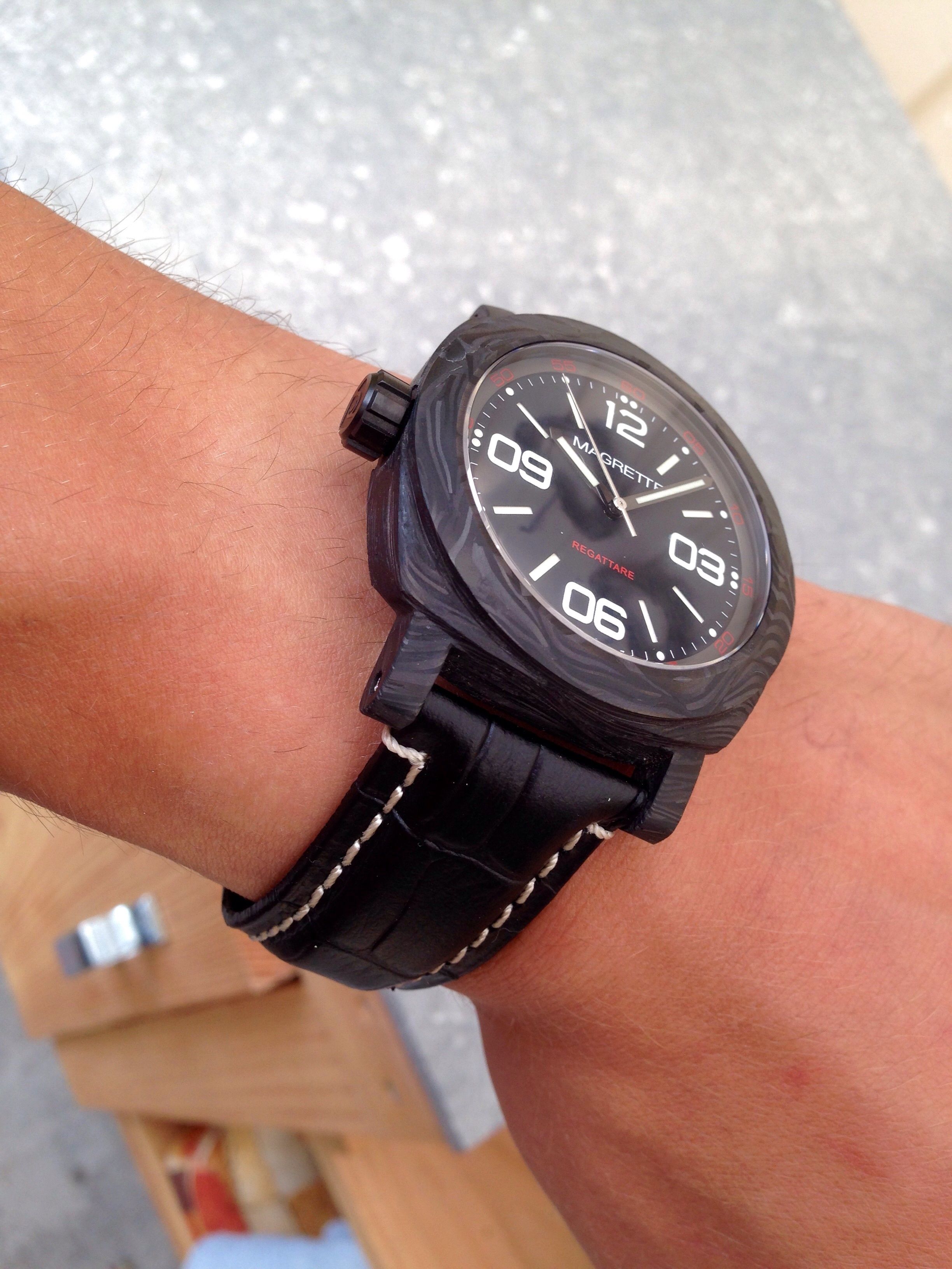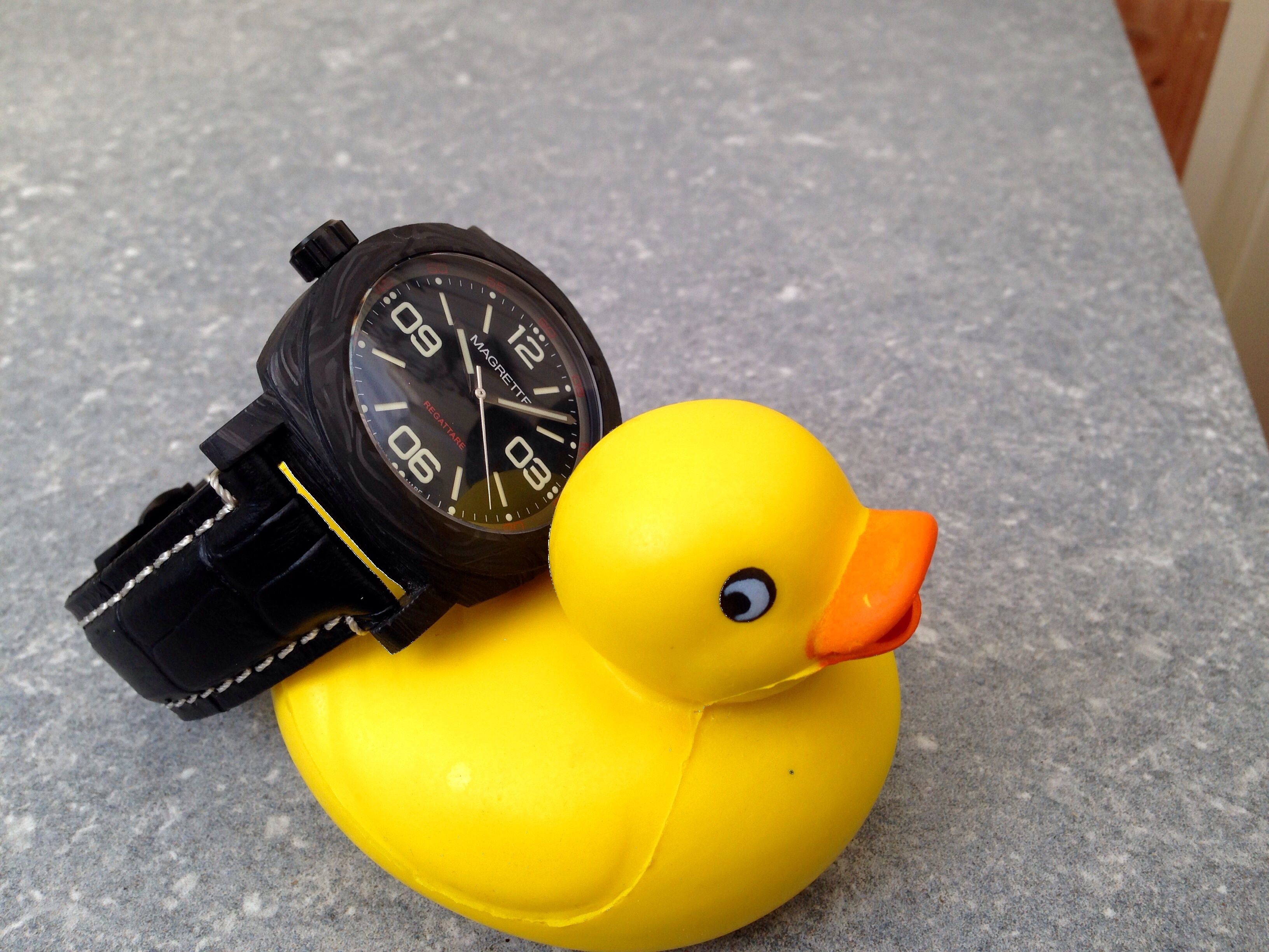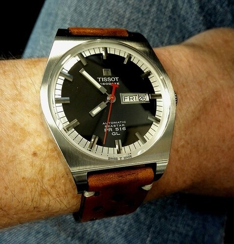 Ben toch voor een zwarte band gegaan, mede doordat de andere banden te uitgesproken waren om āevenā te kopen. En zwart kan ik weer op andere horloges dragen.
