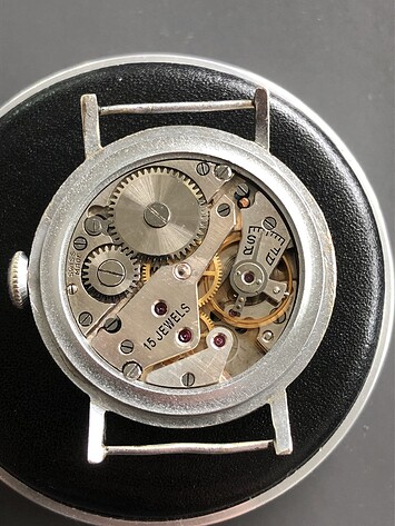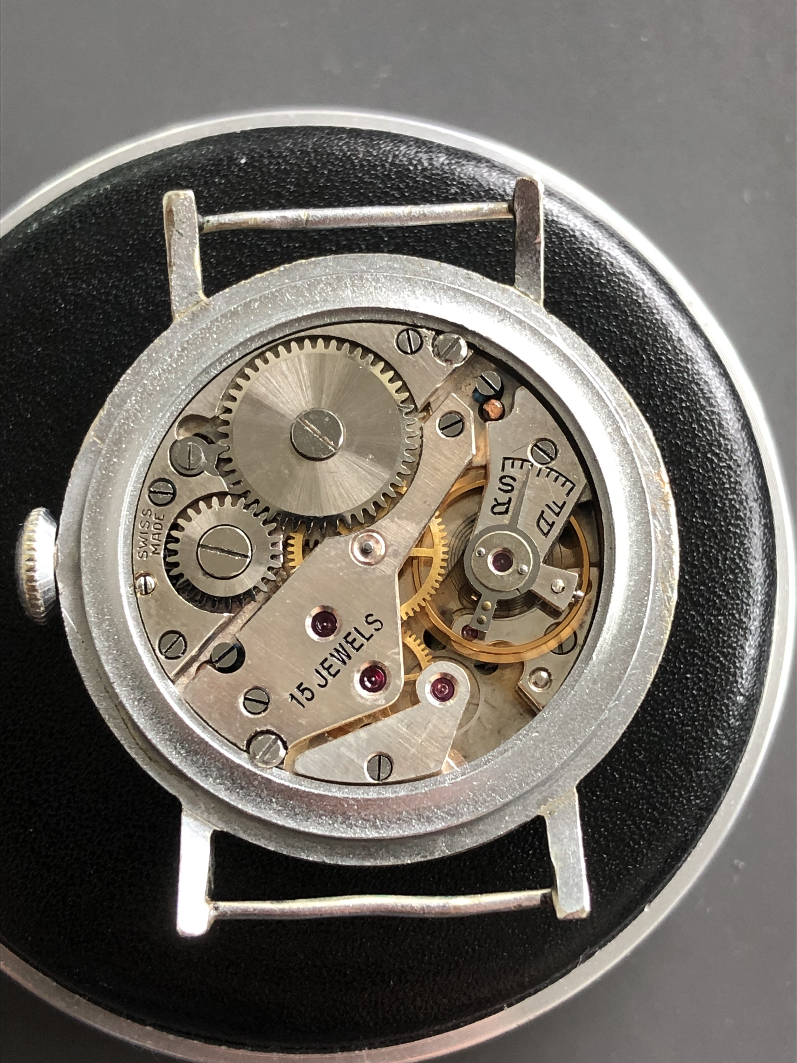 Omdat het uurwerkje weliswaar erg vuil was, maar ook redelijk liep besloot ik om daar niet aan te gaan prutsen. Ik heb al eens vaker verteld dat knoffelpootjes en slecht zicht niet zulke goede vriendjes zijn van de horlogemakerij. Dat het uurwerk een service nodig zou hebben was duidelijk. De amplitude was zichtbaar laag, maar het liep. Een proefje met een paar druppels wasbenzine op de lagertjes, waarbij het balansje onmiddellijk enthousiaster ging bewegen, was voor mij voldoende aanleiding om te besluiten het horloge verder wel, voor zover mogelijk, cosmetisch op te knappen.
