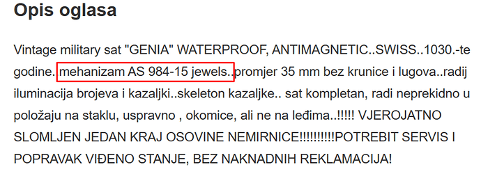 In die advertentie stond weliswaar geen afbeelding van het uurwerk, maar in de beschrijving stond uitdrukkelijk vermeld: AS 984.