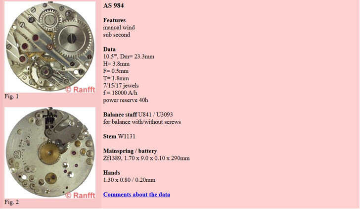 In het horloge met de rode achtergrond, dat erg op mijn Genia lijkt, zit net als in mijn exemplaar een AS 984 kaliber uurwerk. In de Genia van de ‘Lot Search’ veiling zit, gezien de configuratie van de wijzerplaat en de eveneens vrijwel dezelfde kast mogelijk hetzelfde kaliber.