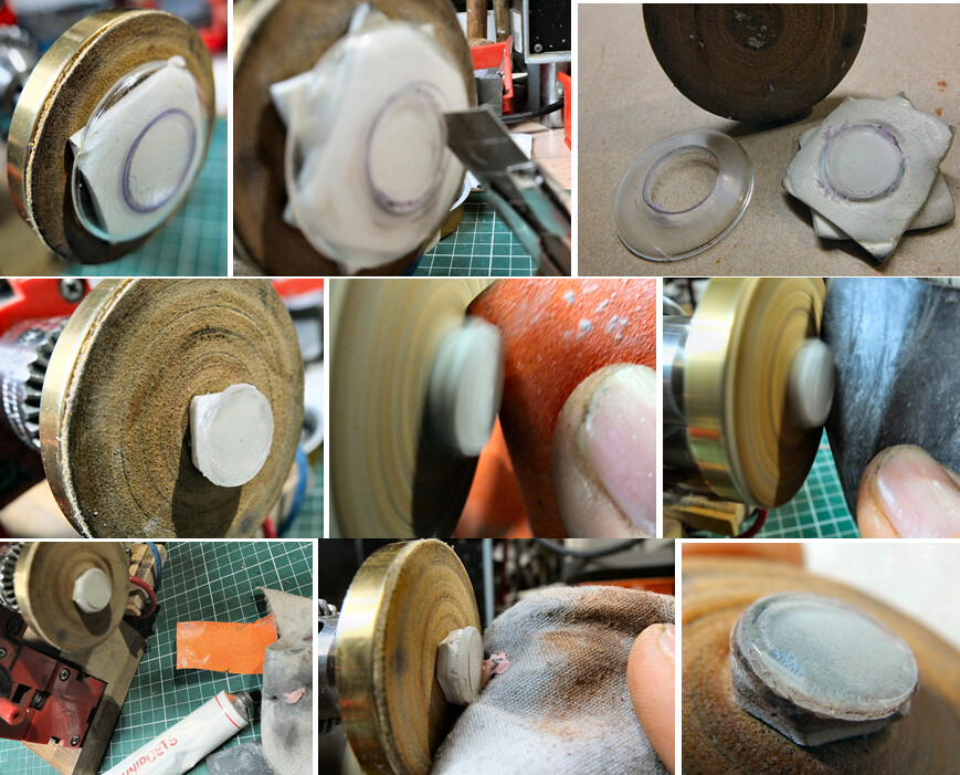 Ik heb best veel plexi glaasjes in voorraad, maar zulke kleintjes heb ik niet en bestellen wilde ik niet, want dat duurde me te lang. Zelf maken dus. Een eerste poging met een vlak glaasje uit een stukje dun acrylglas mislukte. Het glaasje moest bol zijn, anders liepen de wijzertjes tegen het midden aan.