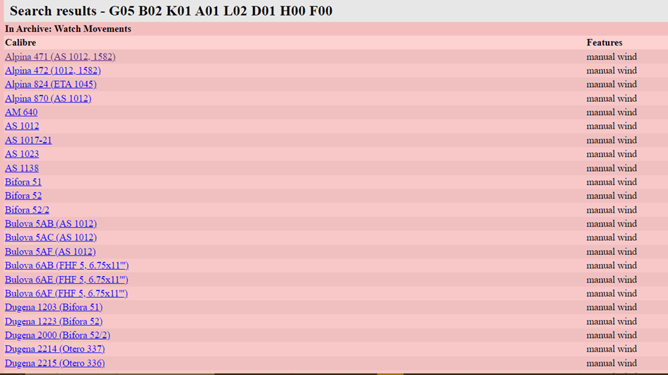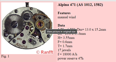 Wat betreft de Ranfft database: wanhoop niet te gauw. Mijn ervaring is dat je in ruim 50% van de gevallen wèl het juiste uurwerk, en dus de bijbehorende data kunt vinden. Twee aannames van mij daarbij: hoe ouder en daarom vaak zeldzamer het kaliber, hoe groter de is kans dat het er niet in staat. Ten tweede: er staan meer uurwerken in voor heren- dan voor dames maten. De combinatie in mijn