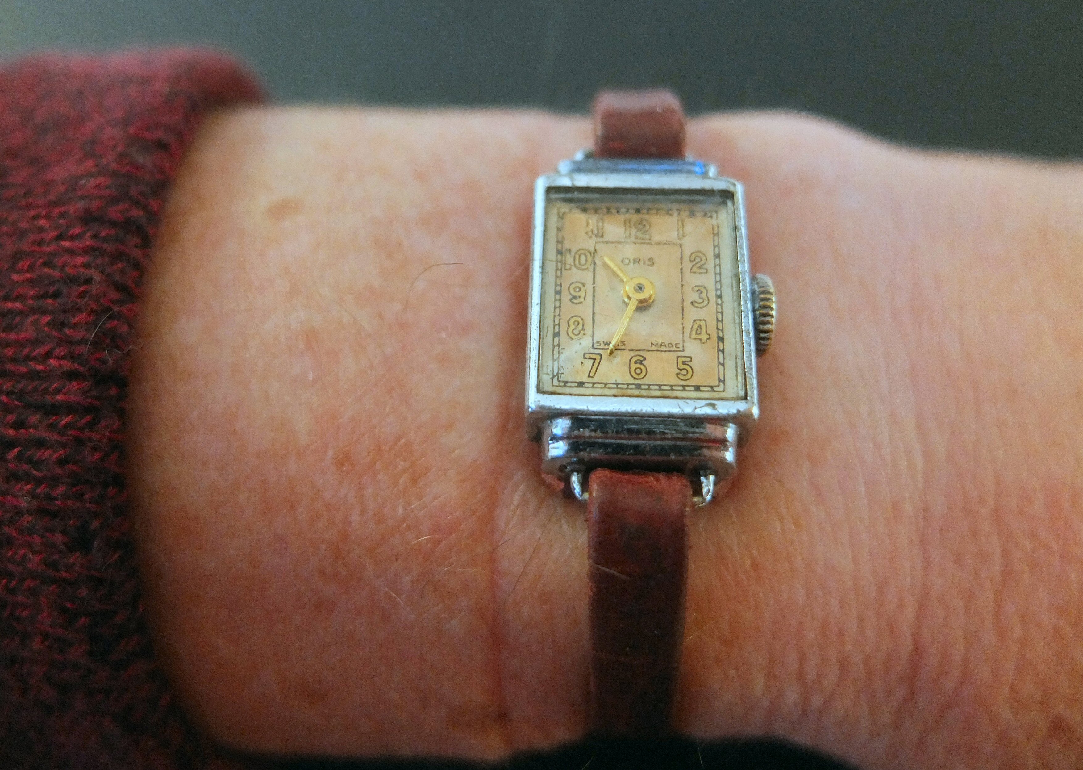 Hierboven het uiteindelijke resultaat. Een lief oud klein horlogetje van nette Zwitserse origine. Een kleine honderd jaar na haar geboorte opgevist uit een rommeldoosje met losse onderdelen en nu weer geschikt om nog een paar jaar dienst te kunnen doen. Ze zal waarschijnlijk niet zolang bij mij blijven wonen maar binnen afzienbare tijd weer terug verhuizen naar haar geboorteland, waar mijn dochter, die in Zürich woont, haar met liefde aan de pols zal koesteren.