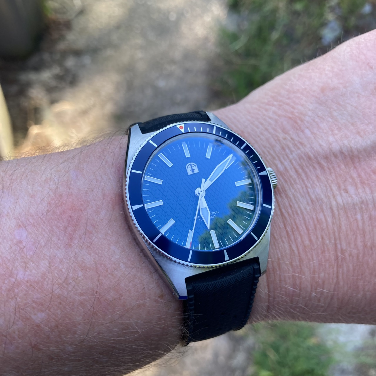 Op aanraden van forumleden bij “Ome Alie” deze €11 FKM rubberen band voor mijn Aqua Terra aangeschaft. Een originele Omega strap was voor dit horloge niet verkrijgbaar. Ik ben er erg tevreden mee. Van de winter gaat de originele leren band er weer op.