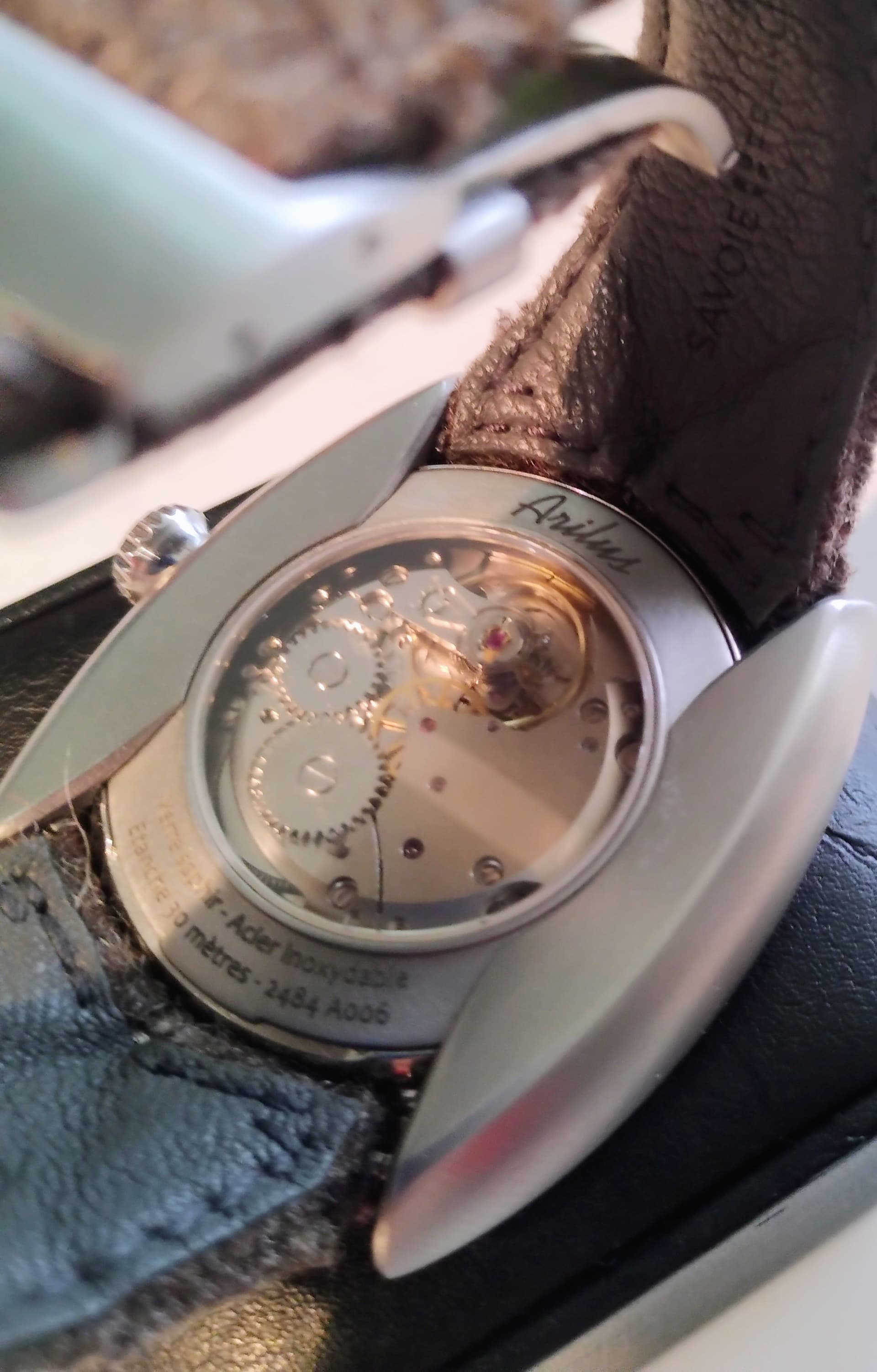 Waar ik ook nog ¨Chapeau!¨ zeg, is dat Arilus bijna uitsluitend lokale partners gebruikt. Van het frezen in Marnaz(Haute-Savoie) tot het polijsten in Cluses(Haute-Savoie), het markeren, graveren, laseren, etc. alles word in de twee Savoies gedaan. Alleen het uurwerk komt van net over de grens: een Sellita SW215-1 met handopwinding ![]()