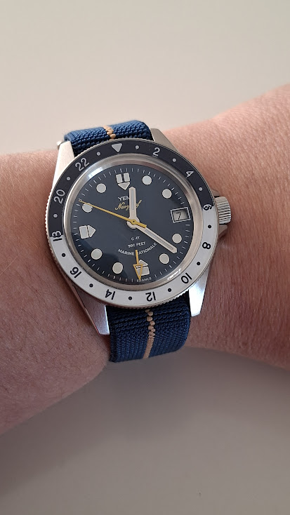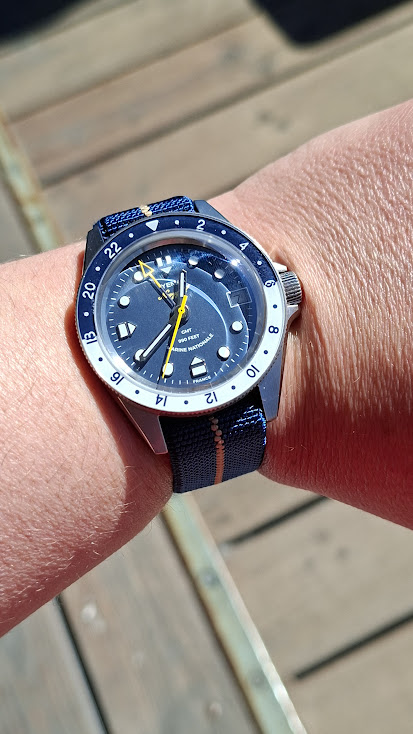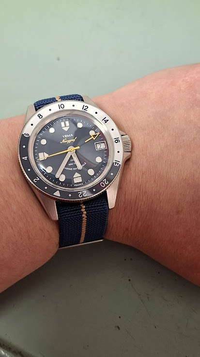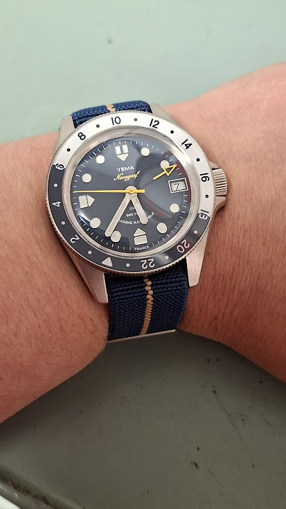 Voor nu nog eventjes een paar fotootjes van deze vet coole Yema Marine Nationale Navygraf GMT die een apart instelbare gmt wijzer heeft voor een 2de tijdszone, een bezel waarmee een eventuele 3de tijdszone ingesteld kan worden - gaan we veel gebruiken hoor we zijn immers nog nooit op vakantie geweest