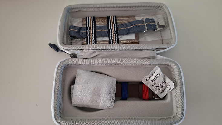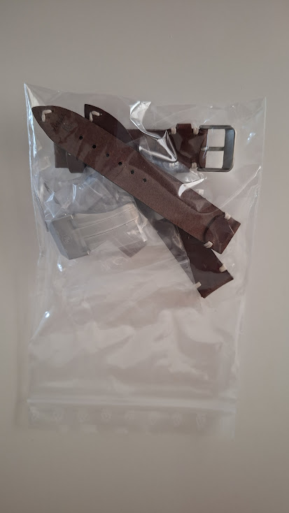 Er zitten verschillende pakjes in zeg, 2 extra buckles en een extra lederen band als extraatje