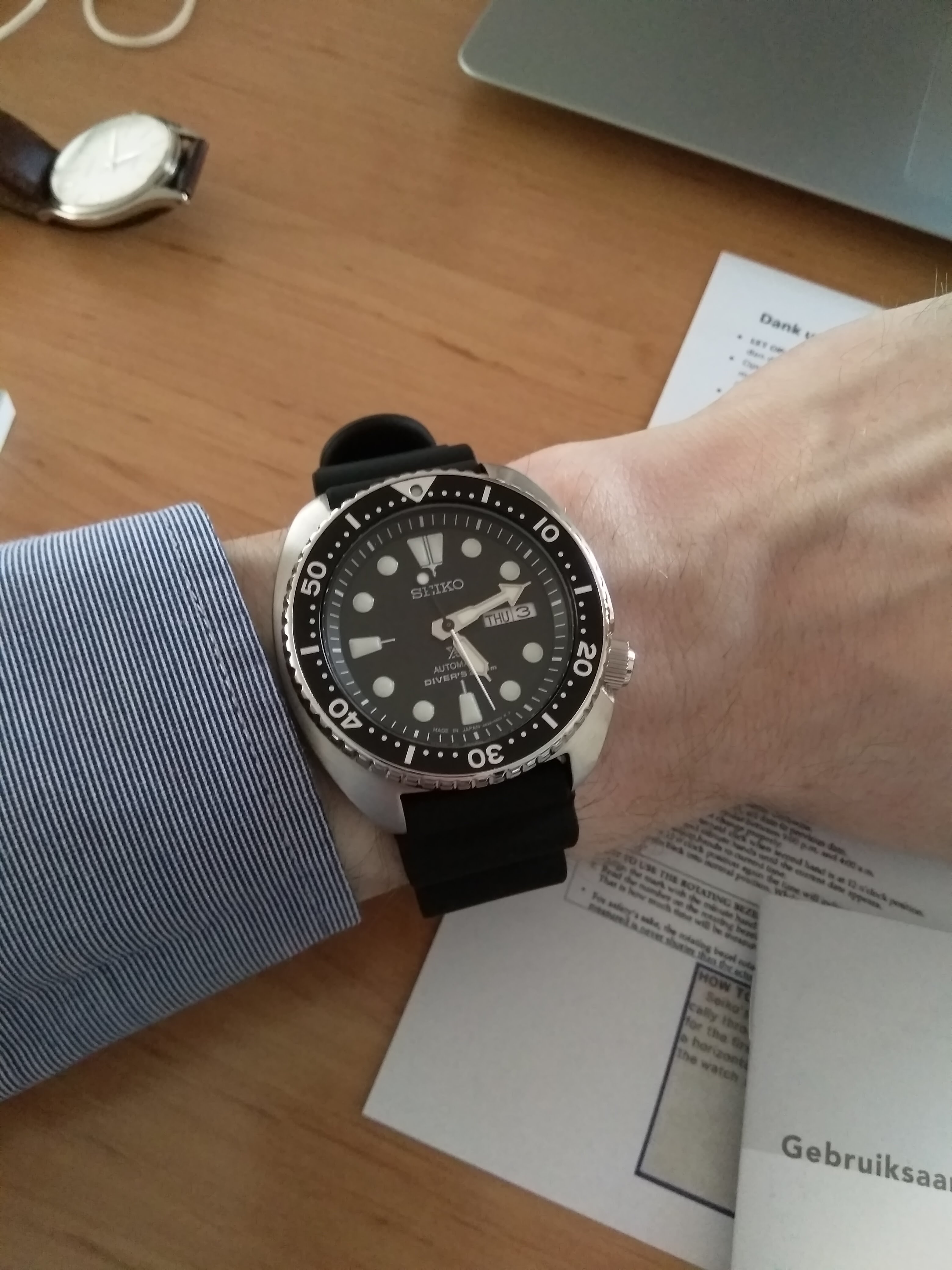Het is wel even wennen aan zo’n relatief groot en zware klok (heb de afgelopen jaren alleen lichte en/of kleine horloges gedragen) maar toch is de turtle verrassend comfortabel op mijn pols. Heeft denk ik te maken met de kussen-vormige kast.