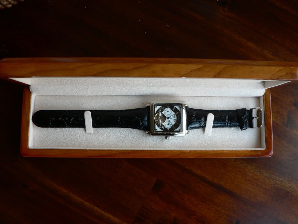 kwam in een mooi afgewerkt echt houten kistje, het horloge ziet er met een oogloepje ook spatzuiver uit.