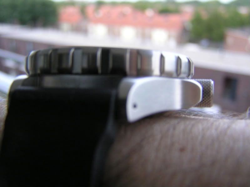 De bezel diameter is iets meer dan 41 mm, maar door de kleiner uitgevallen wijzerplaat komt het horloge om de pols niet zo groot over. Echter van de zijkant gezien, is er toch een behoorlijke aanwezigheid.