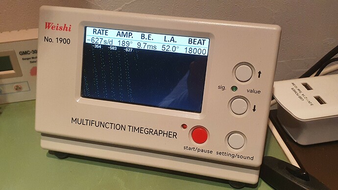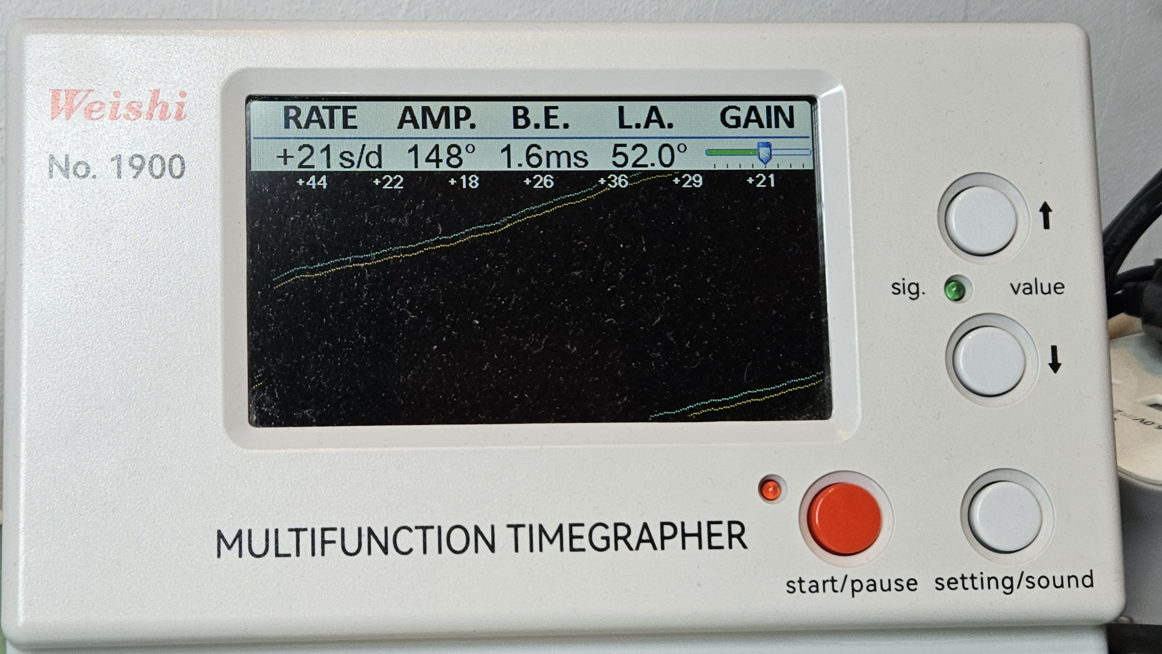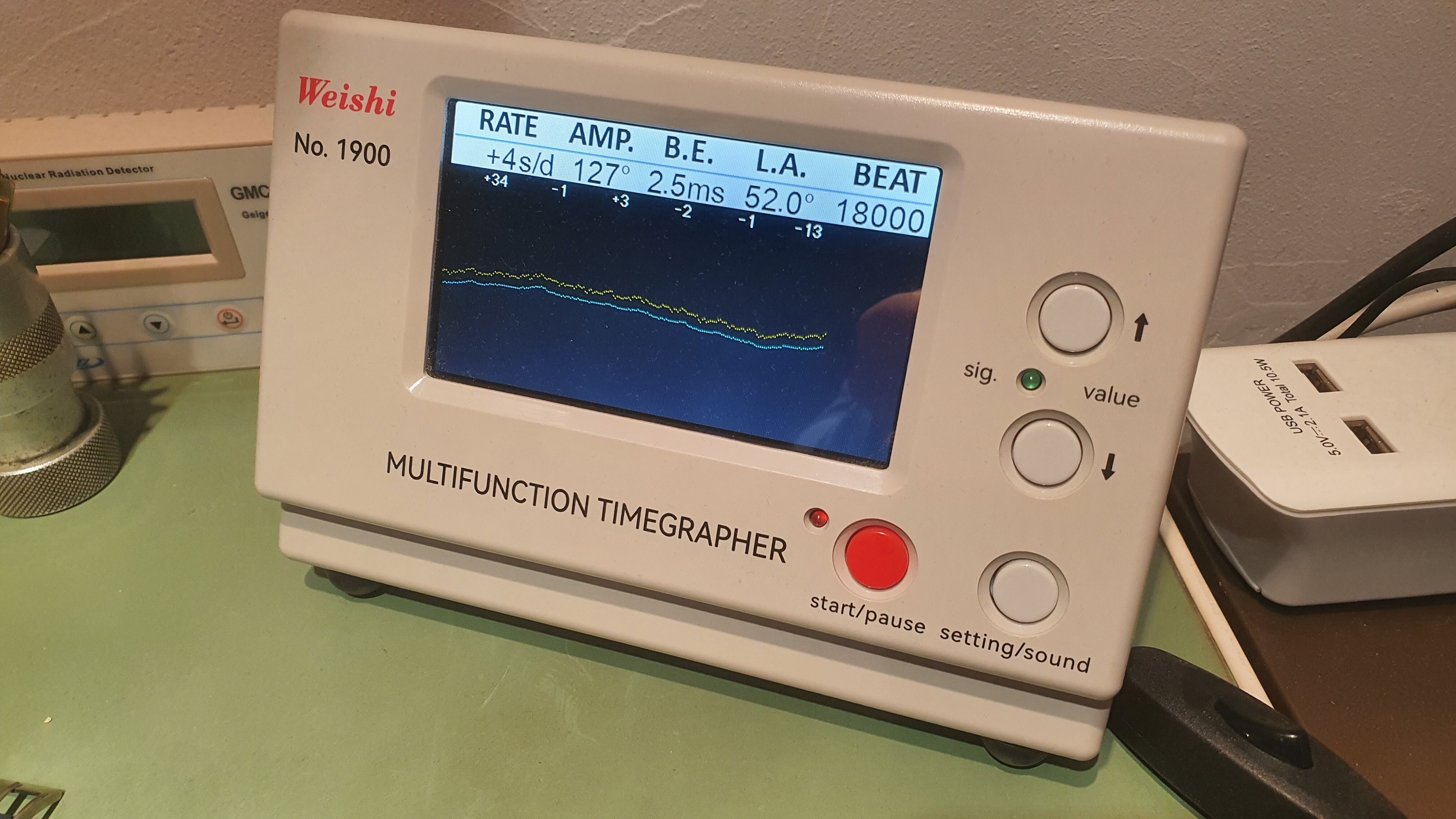 Intussen ontdekt dat er een en ander goed gemagnetiseerd zat in het binnenwerk. Beginnersfout nummer zoveel - paar maanden stilliggen deed overduidelijk geen goed. Dat was gelukkig snel verholpen. Tappen van de balansstaf onder de microscoop gecontroleerd, pico bello. Juwelen proper en niet beschadigd. Goed geolied.