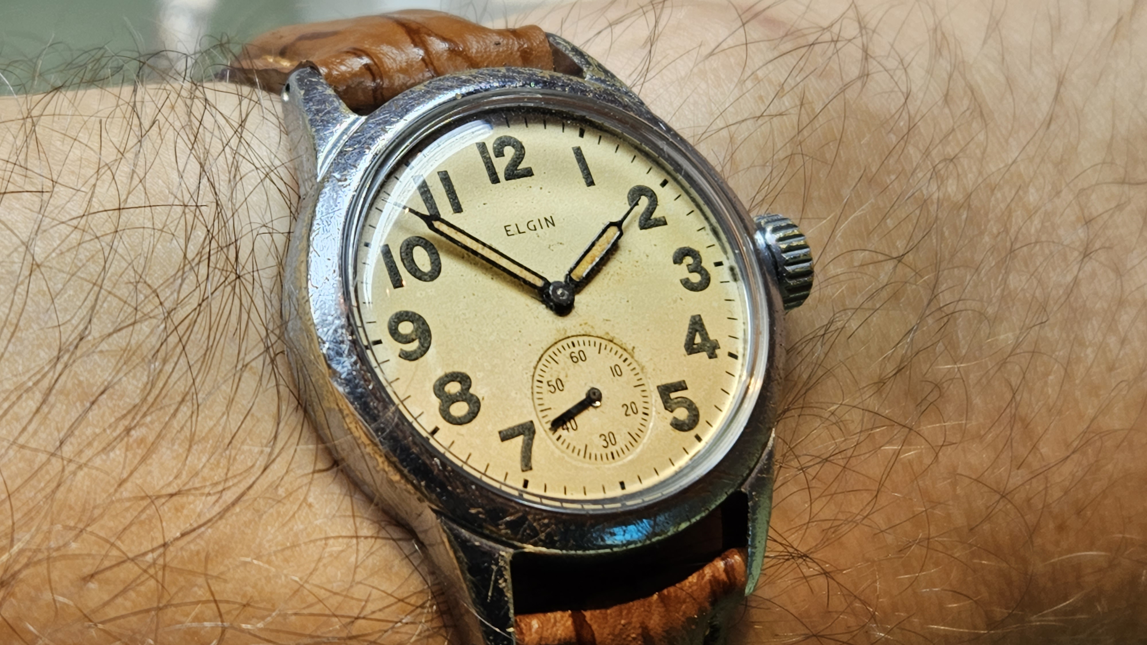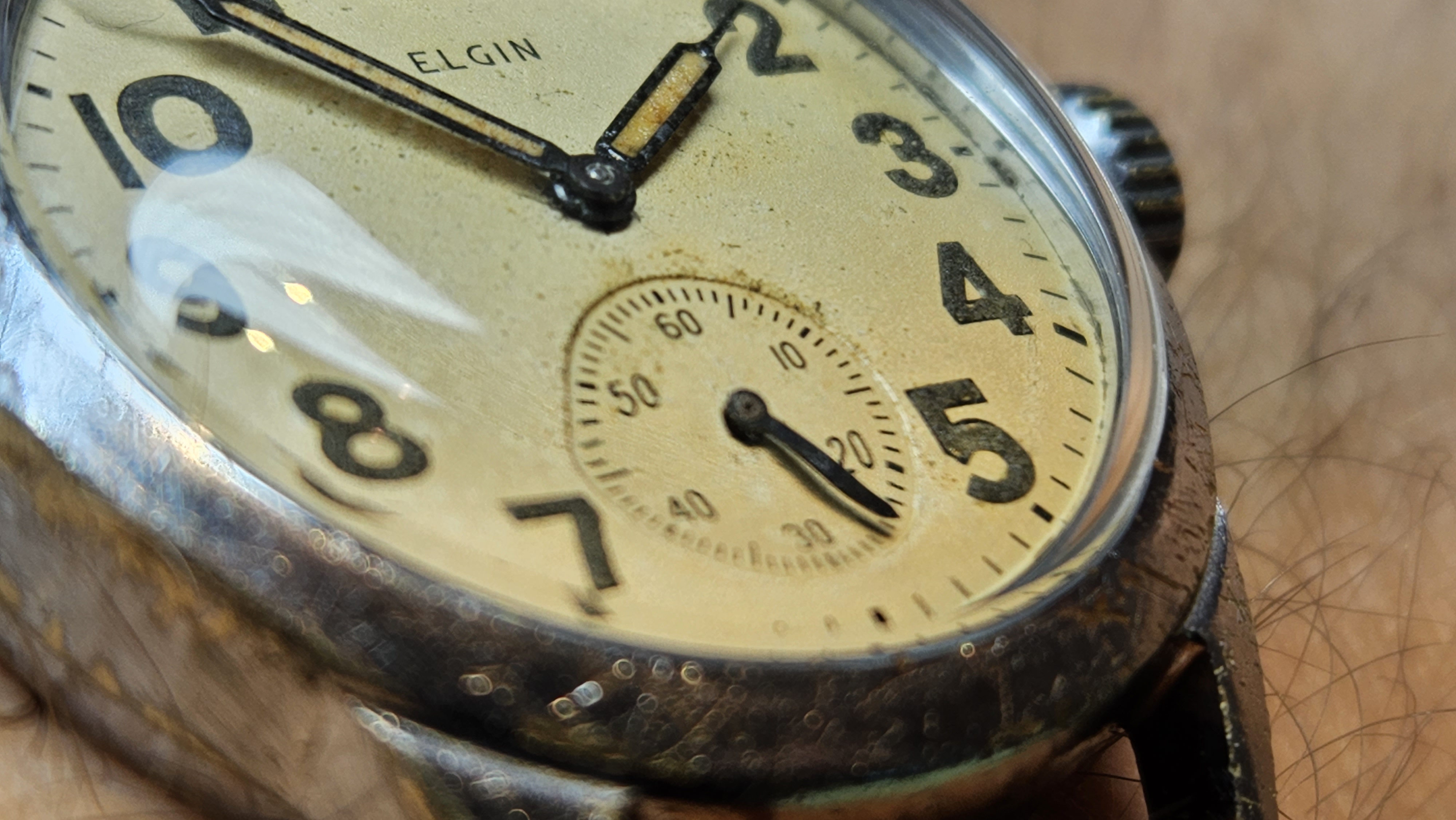 Het betrof een Elgin. Military issued, ergens midden de tweede wereldoorlog. Binnenin een kaliber 580, wat met zijn 7 juwelen de goedkope versie voor het gewone voetvolk was. Al wat meer nodig had van een horloge dan zien hoe lang het nog was tot het einde van de wachtronde kreeg een variant met een pak meer steentjes. Het glas was geel verkleurd, één grote barst, en het ding deed niks nul nougabollen. Oké.