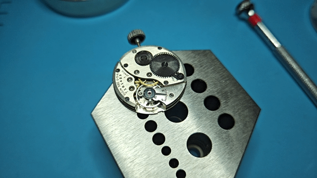 Jezus moederneukende christus, wat een botch job. Het horloge-equivalent van Oneal Morris. En voor iemand het vraagt: ja, zelfs met die amateuristisch dichtgeknepen collet waar de veer met het equivalent van een telefoonpaal was ingeramd hield die niet vast op de balansstaaf dus er zat nog een goeie kwak contactlijm onder ook.