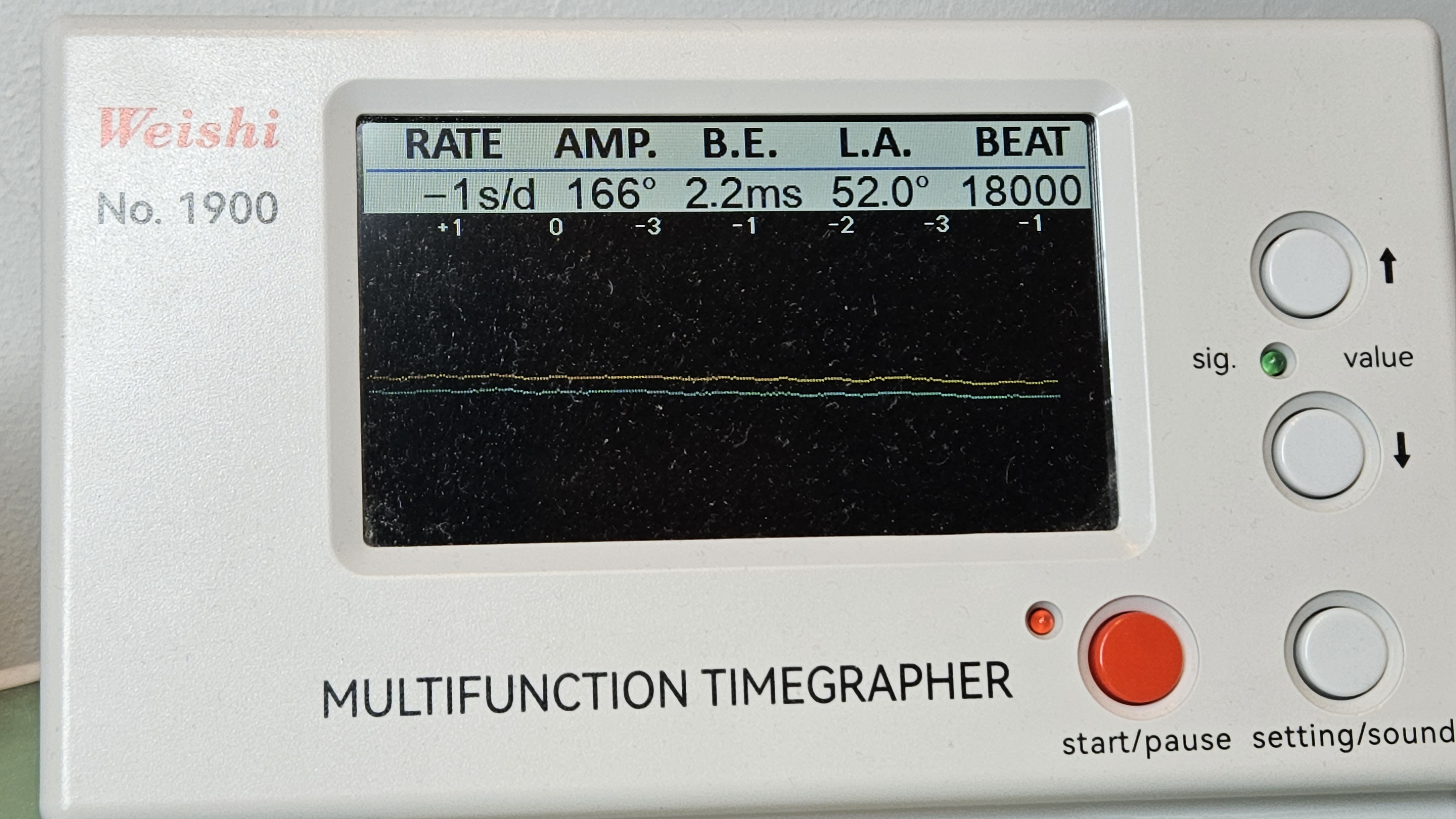 Ik had graag gezegd dat het daarmee af was. Dat de cijfers goed waren voor de leeftijd, terug de kast in, het oude glas (dat trouwens oplicht onder de UV lamp. Fun fun fun) vervangen door een nieuw, bandje erop, wristshot, blabla.