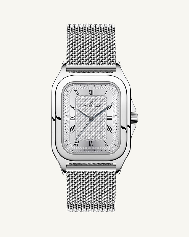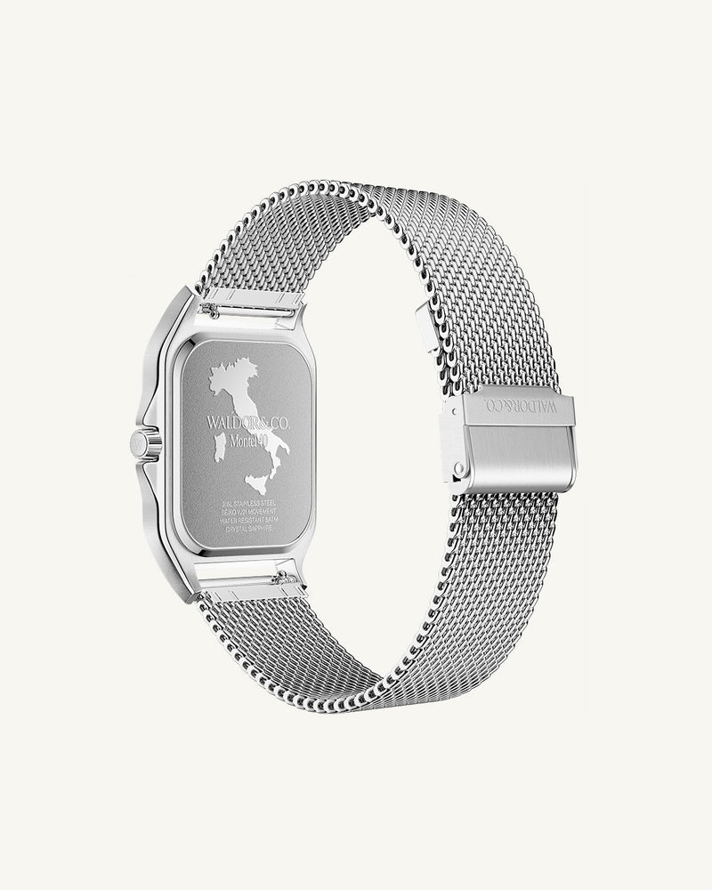 Mijn oog is specifiek gevallen op het model Montel 40 Camogli. Het design spreekt mij aan: strak, minimalistisch en net even anders dan de standaard ronde kast. Het horloge is uitgerust met een quartz-uurwerk (Seiko VJ21), saffierglas en een mesh-band. Prijs: €319