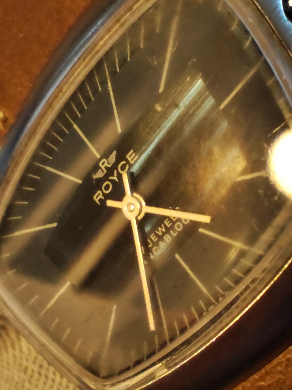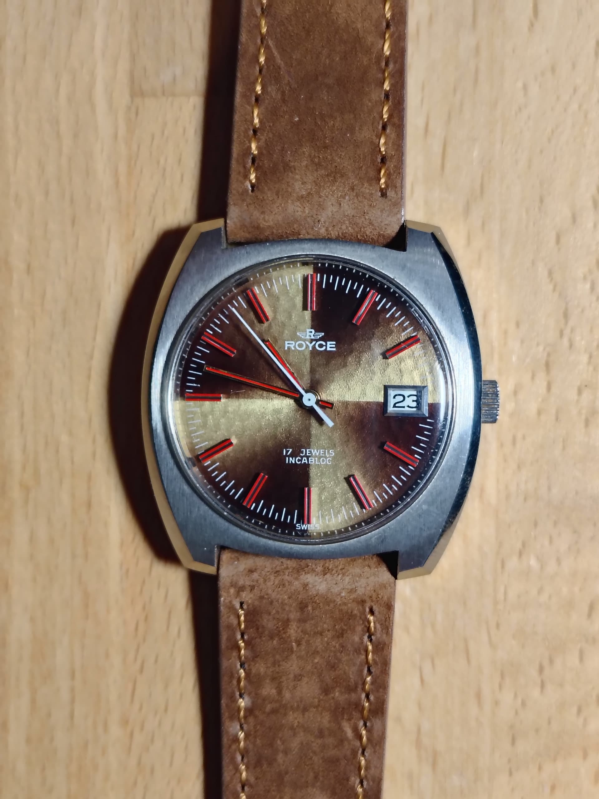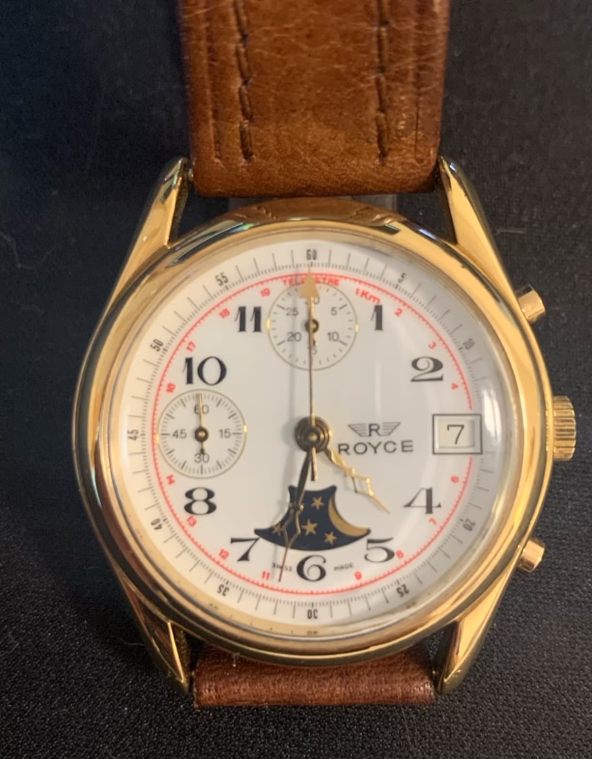 In de jaren 80/90 waren er ook van die betaalbare (in mijn ogen spuuglelijke) Valjoux-aangedreven maanfase horloges voor relatief weinig geld. Vaak aangeboden met nietszeggende plakmerken. Bas en ik hebben er eentje gevonden met Royce erop, maar dat zal één van de laatste stuiptrekkingen geweest zijn van het merk: