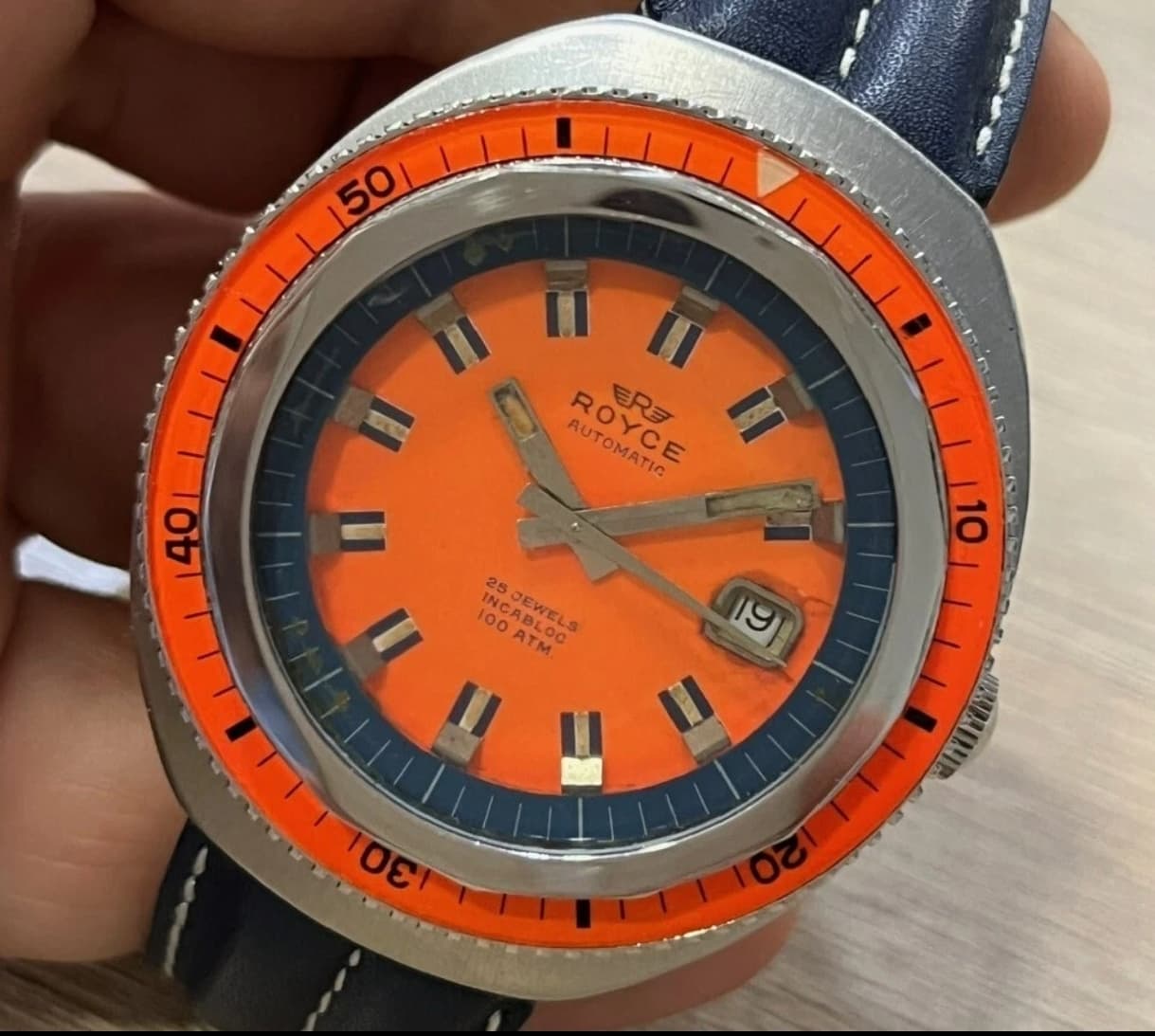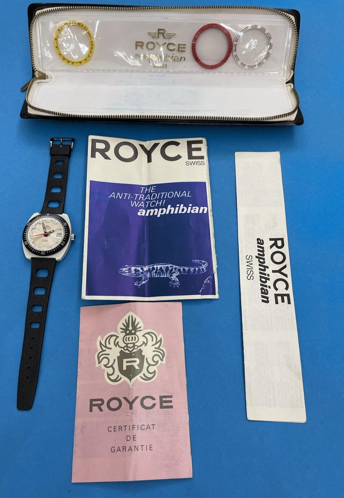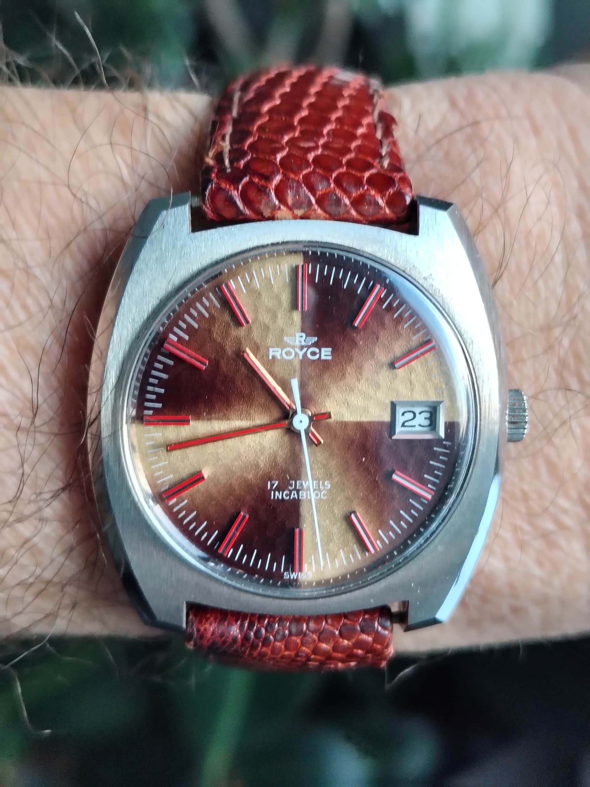 In de jaren 80/90 waren er ook van die betaalbare (in mijn ogen spuuglelijke) Valjoux-aangedreven maanfase horloges voor relatief weinig geld. Vaak aangeboden met nietszeggende plakmerken. Bas en ik hebben er eentje gevonden met Royce erop, maar dat zal één van de laatste stuiptrekkingen geweest zijn van het merk: