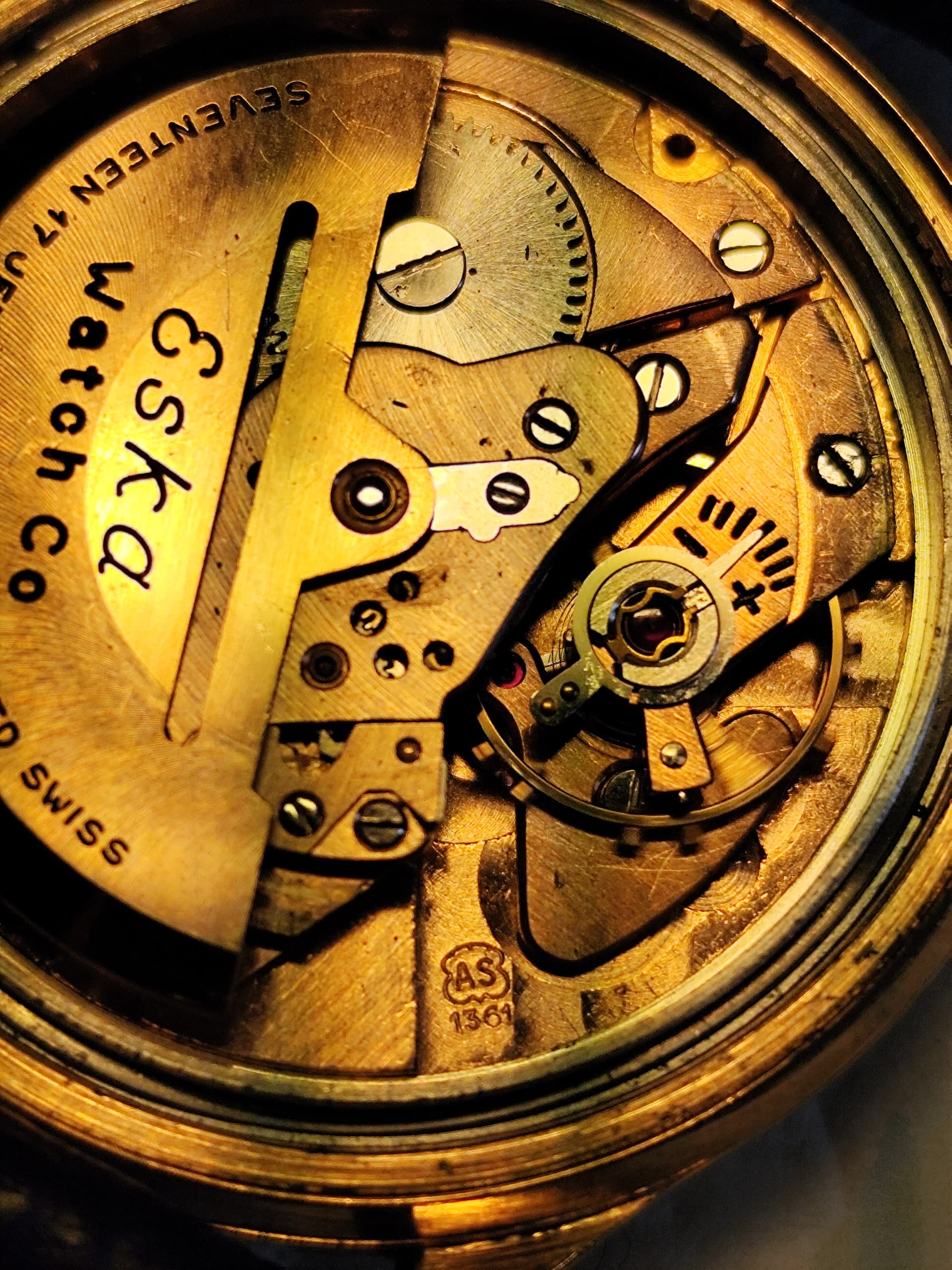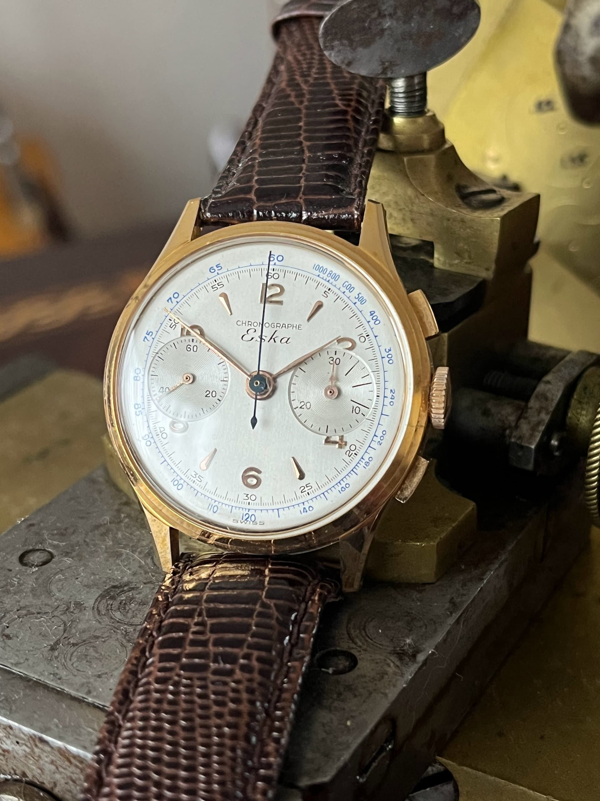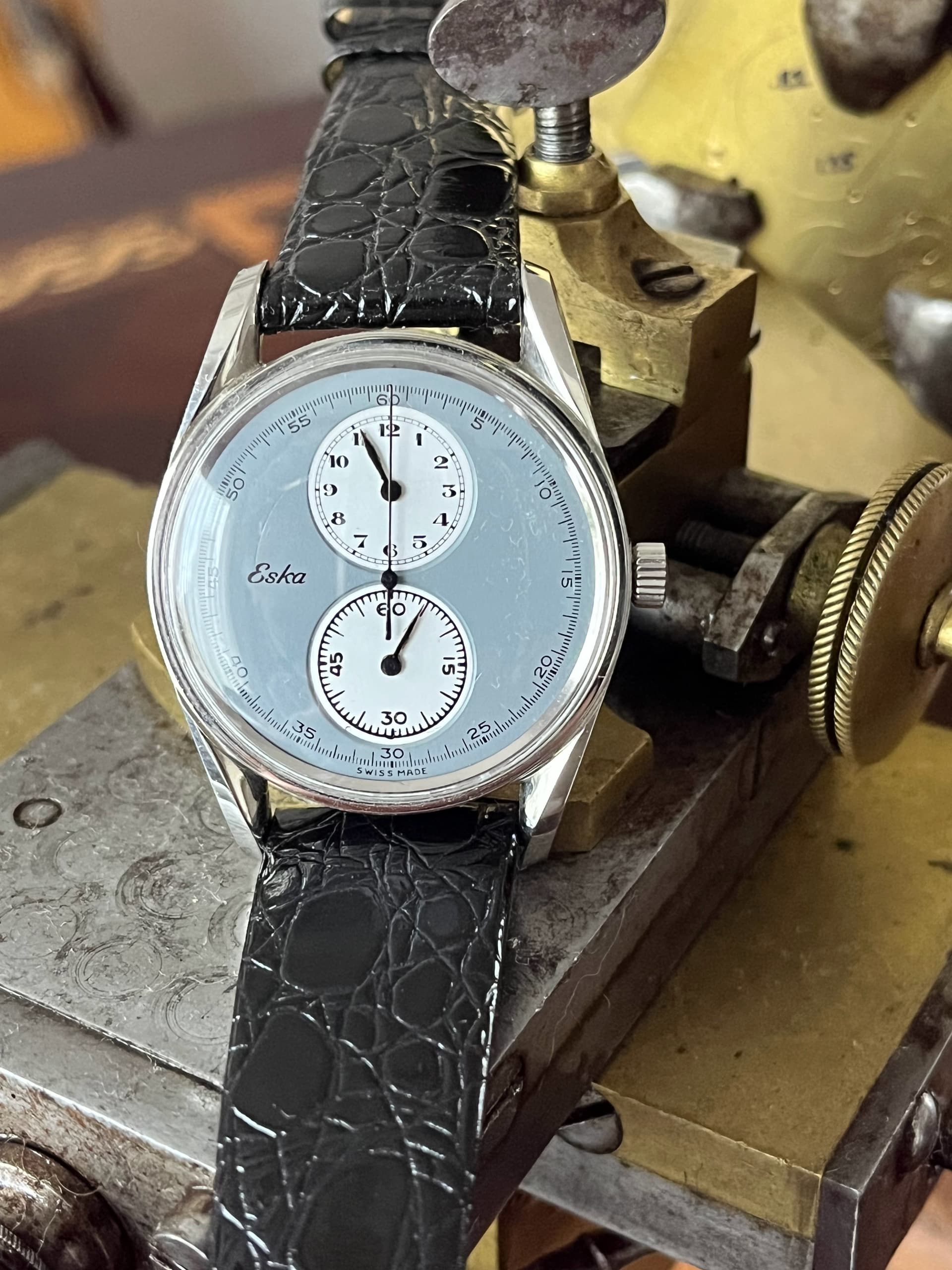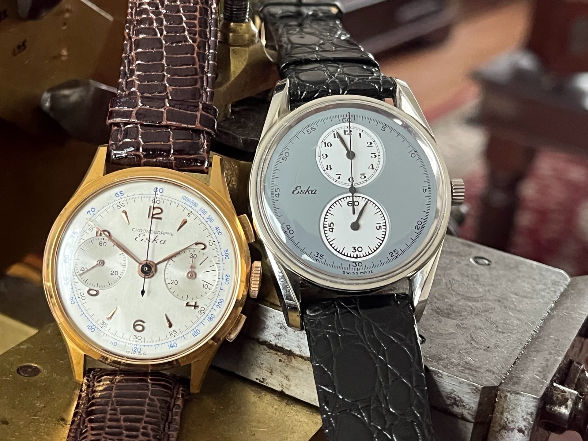Even twee Eska horloges opgeduikeld en wat fotootjes geschoten: een regulateur met een FHF 200 uurwerkje en een chronograafje met een Landeron 51; beide horloges zijn met 36mm behoorlijk groot voor hun leeftijd ![]()