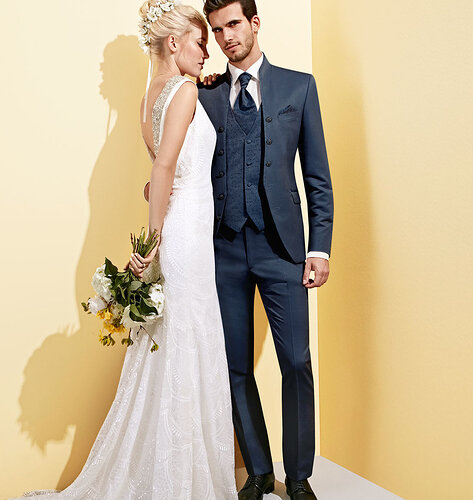 Ziehier. Donkerblauw. Met zwarte schoenen.