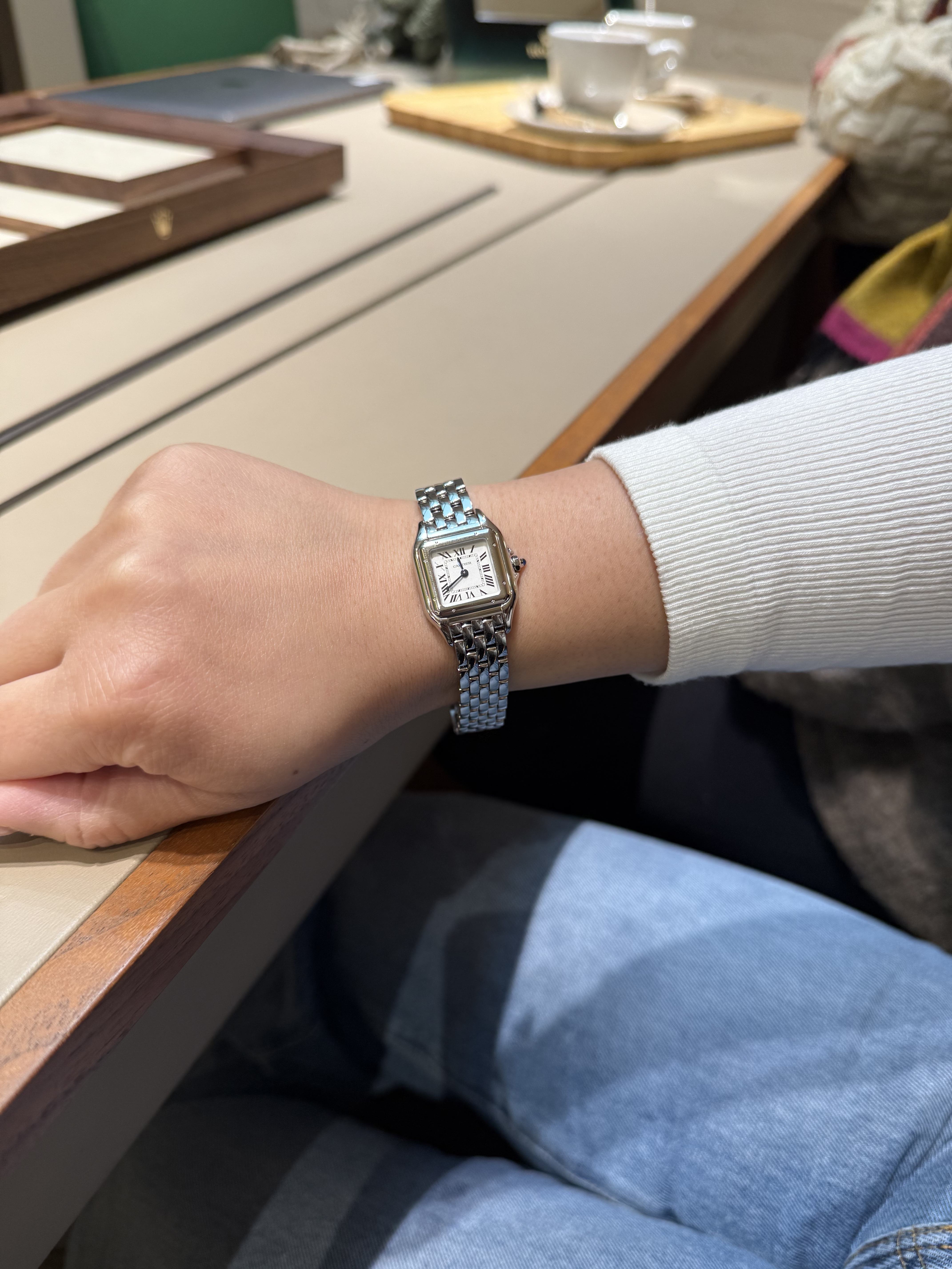 Hoewel mijn zusje eigenlijk voor de Love bracelet ging, vroegen we toch of ze ook een horloge mocht passen. Ze had interesse in de Cartier Panthère small duotone. De exacte uitvoering was er niet, maar ze mocht wel de metalen versie passen. Dat beviel eigenlijk enorm.