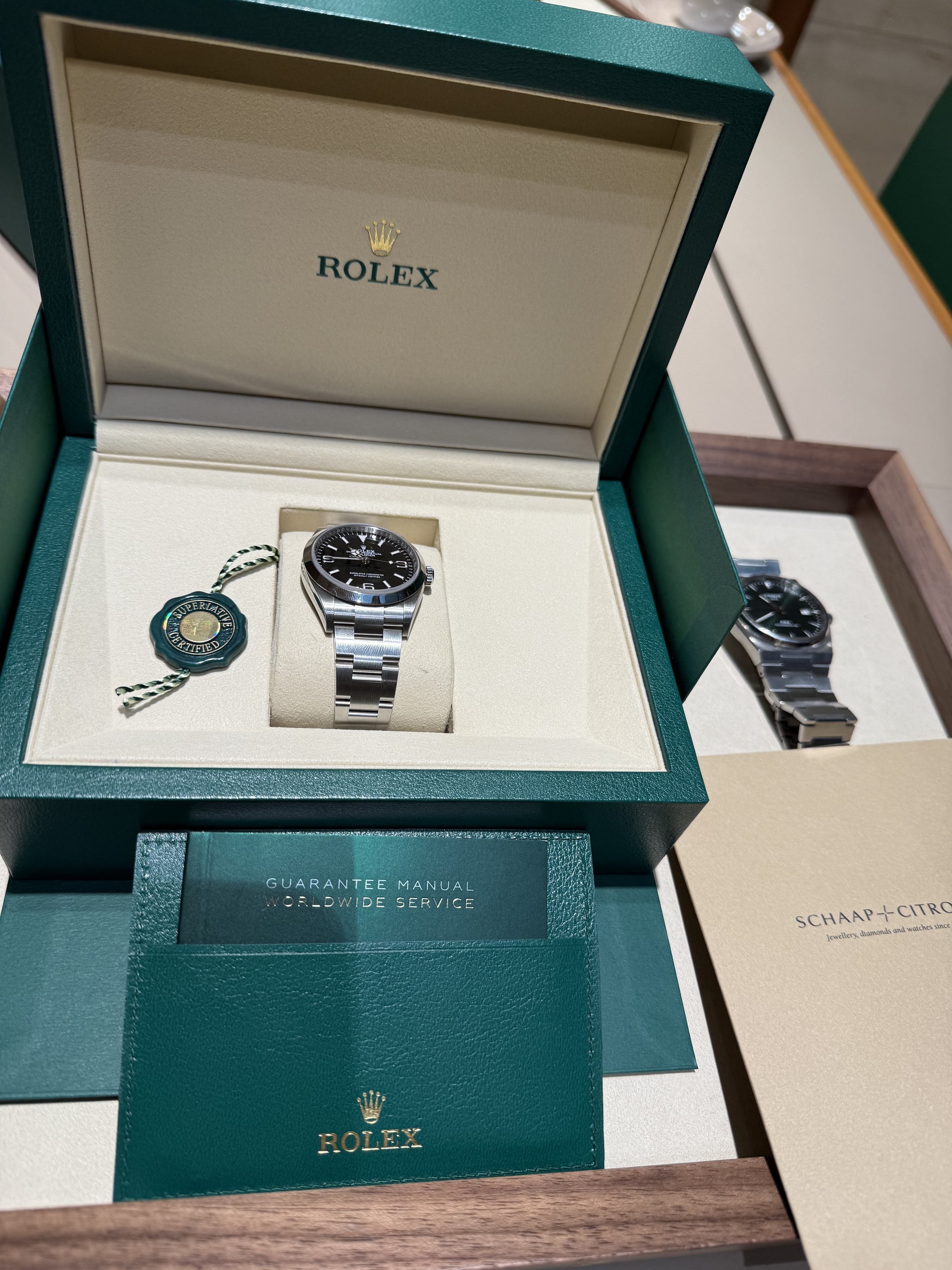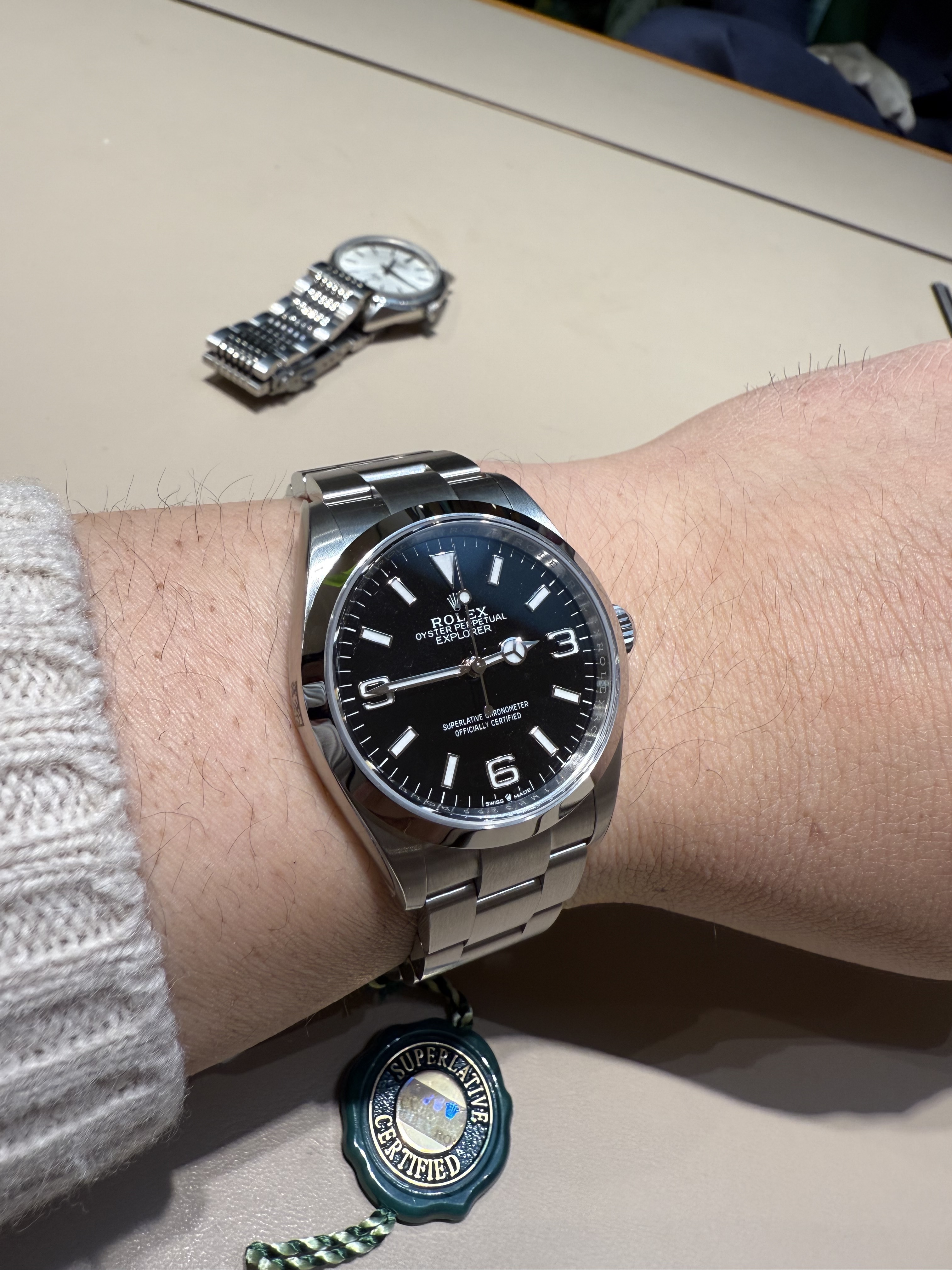 Ik heb toen de Explorer 36 mm (exhibition only) gepast en ter vergelijking ook een Air-King 40 mm, omdat de Explorer niet beschikbaar was.