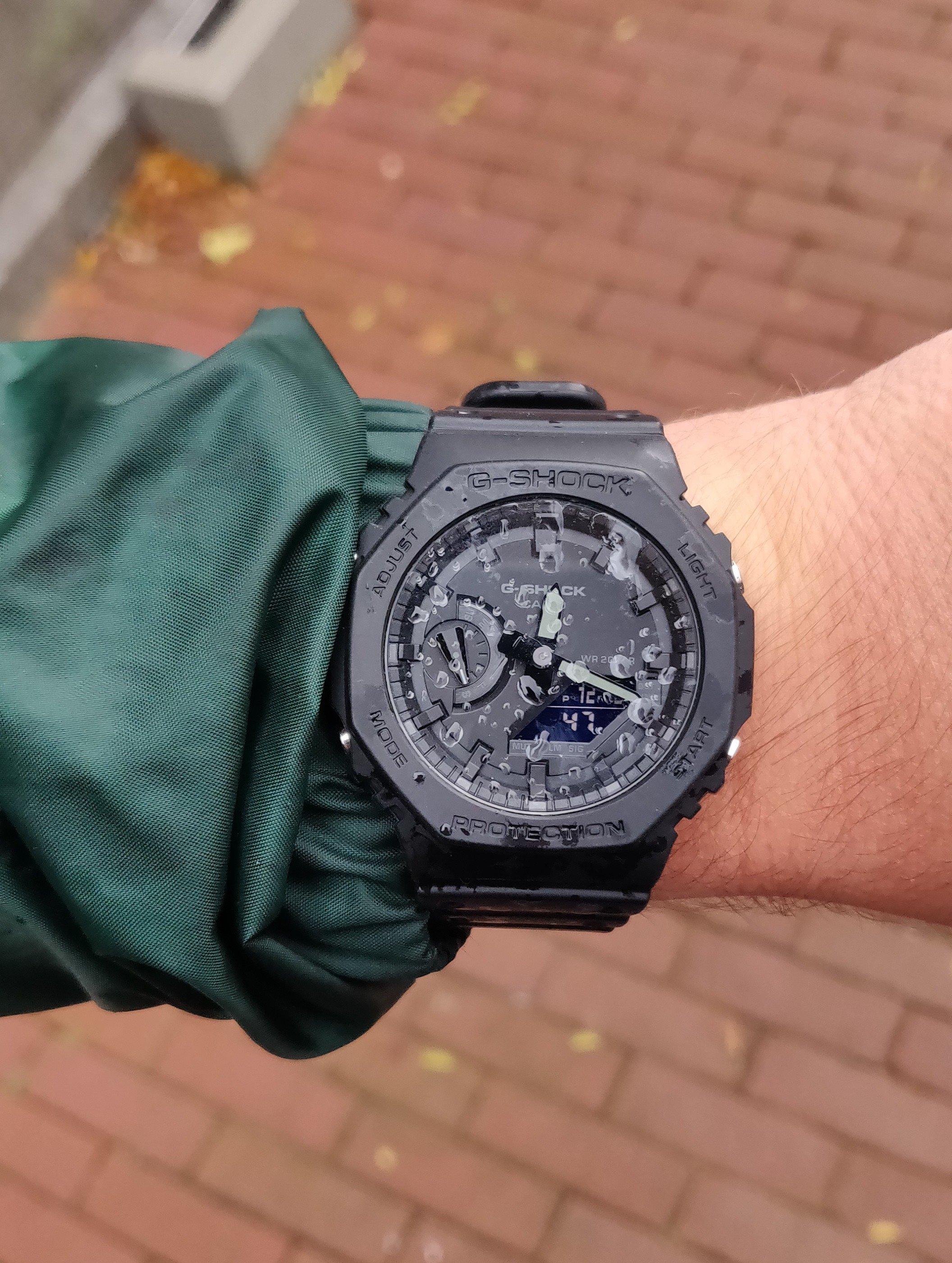 Nooit gedacht dat ik ooit een G-Shock zou dragen, veel te groot en te druk. Totdat deze nieuwe release voorbij kwam en meteen een ware hype werd. Prijzen schieten de hoogte in totdat Casio een nieuwe batch kan leveren. Wat is er aan de hand? Door de relatief compacte afmetingen kan opeens iedereen een G-Shock dragen en velen wagen zich aan het strakke ontwerp, door sommigen de CasiOak genoemd vanwege de achthoekige kast. Vind m prachtig en hij wordt graag gedragen bij ruig weer, kou en andere avonturen die om een onverwoestbaar horloge vragen.