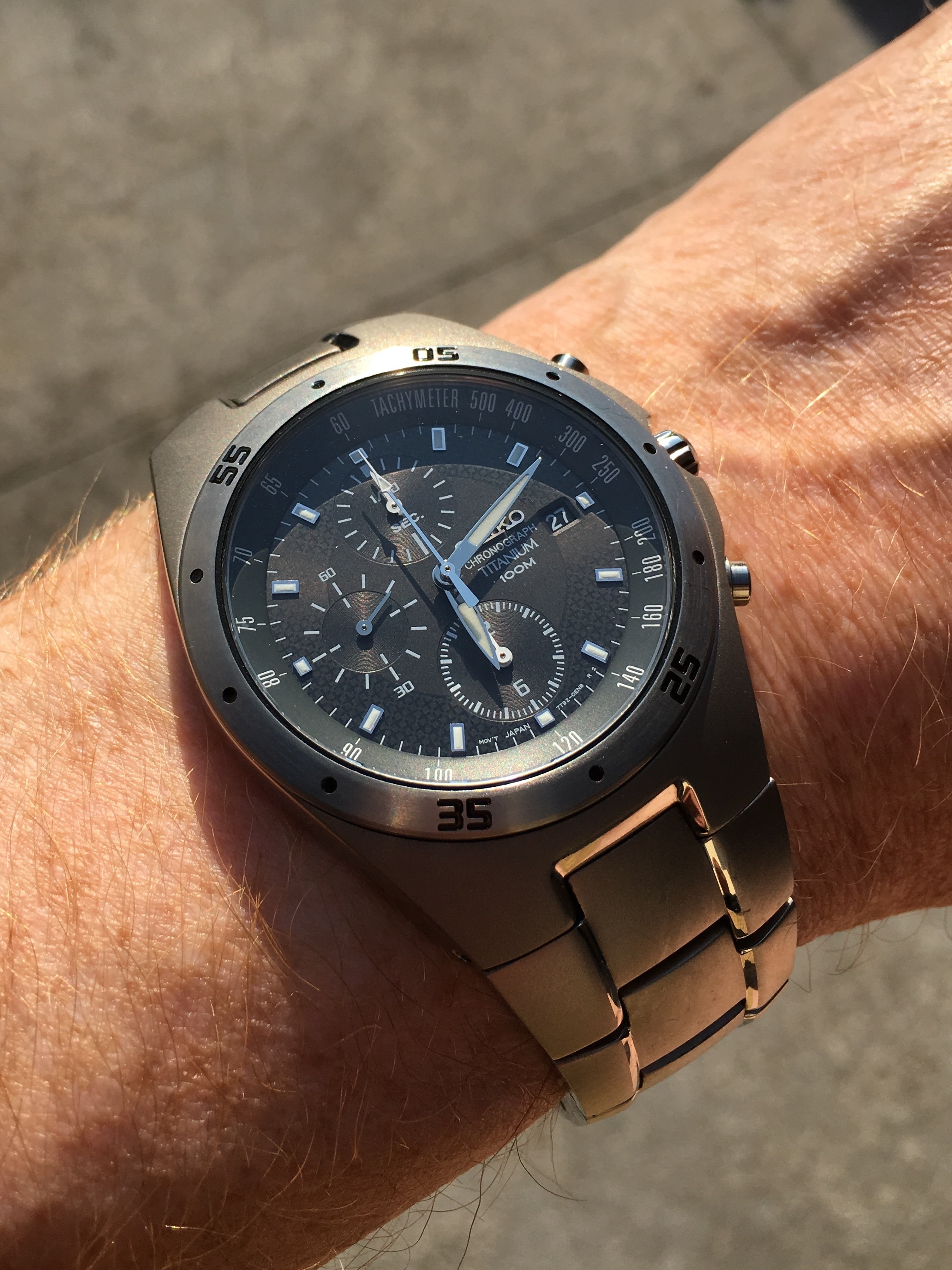 Het eerste horloge wat ik had kreeg ik van mijn vader en was een Seiko waarvan ik me het type niet kan herinneren. De voorliefde voor Seiko is daardoor blijkbaar toch wel ontstaan vrees ik want ik heb dit jaar ook weer een Seiko aangeschaft. Voor velen weinig spannends namelijk een chronograaf van het type SNDA419P1, gezien huidproblemen in het verleden het zekere voor het onzekere genomen en gekozen voor titanium maar ik wil toch weer eens proberen of staal ook tot de mogelijkheden behoort.