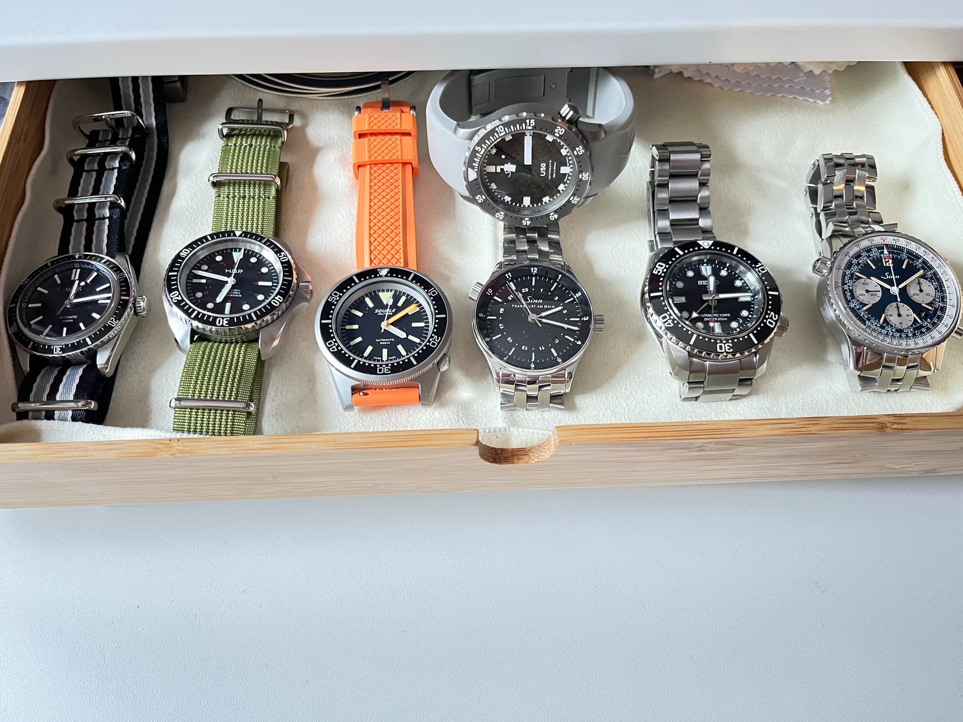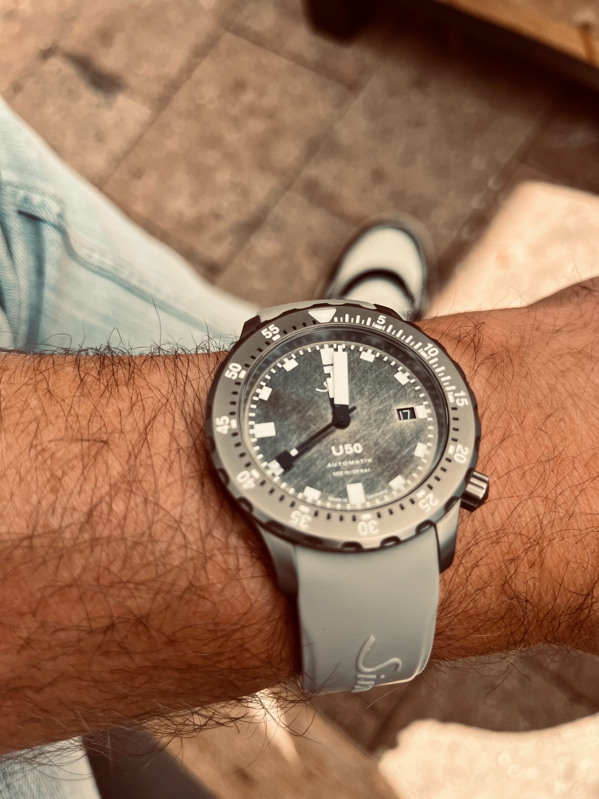 Catawiki liet mij niet los, zo kwam ik de Sinn U50 DS tegen, een limited edition van Duits duikbootstaal. Na een impulsieve bieding bleek er verder geen animo, dus had ik wel even wat uit te leggen thuis . Temeer omdat dat het forum mij tussendoor heeft verleid tot de overname van een toffe Squale en H.G.P…