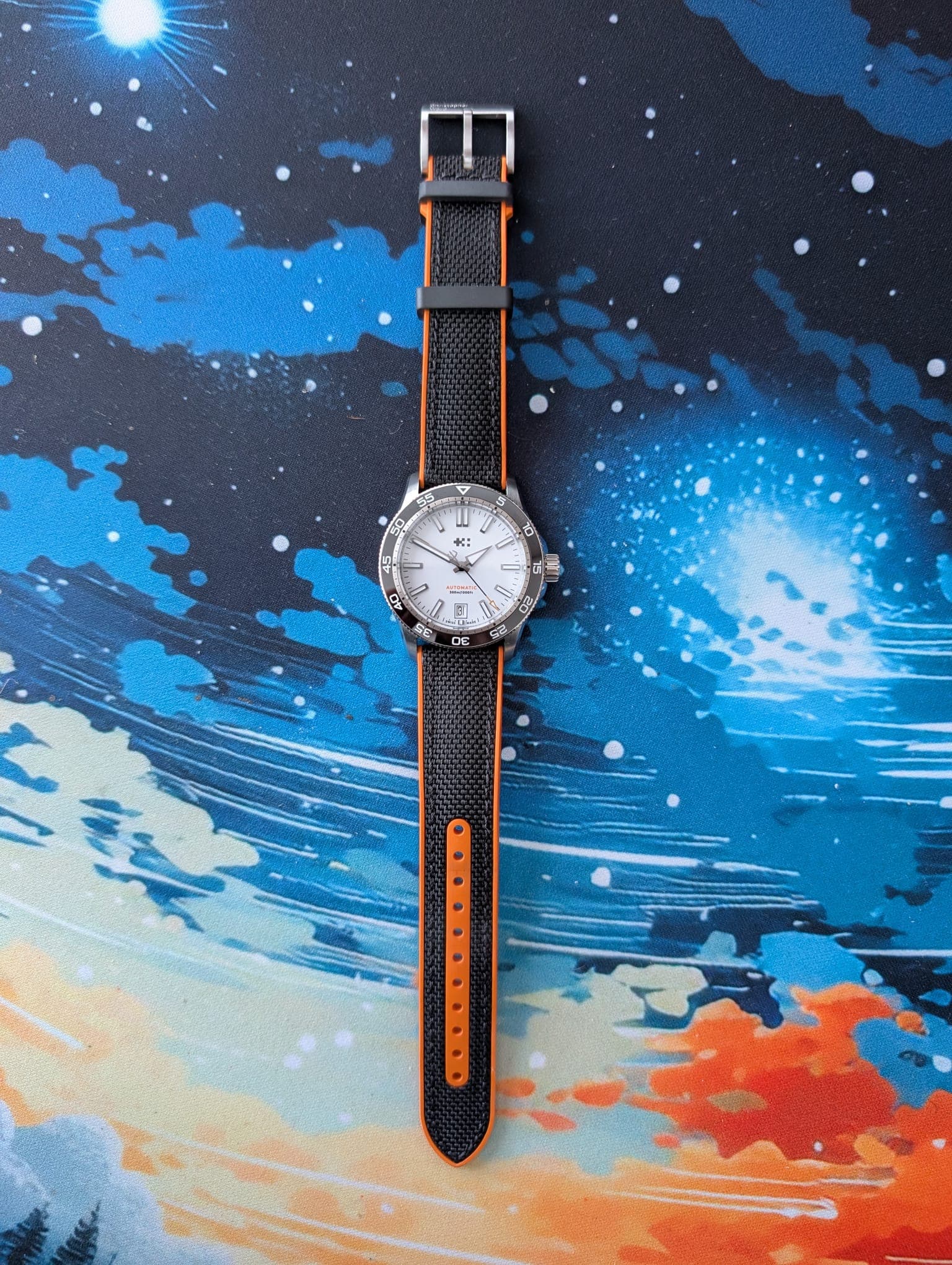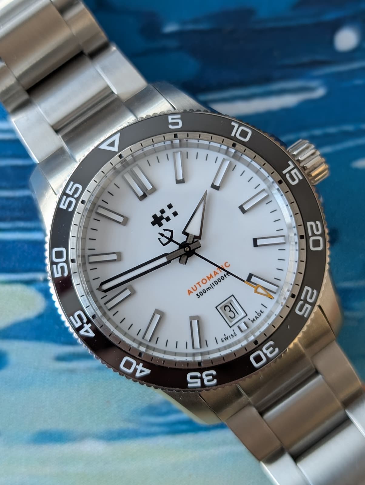 Of beter gezegd: een zo goed als nieuwe derdehands Christopher Ward C60 Trident Pro 300 uit 2023. Diameter 38 mm, witte wijzerplaat, en een prachtige afwerking. Het horloge is bijna 3 jaar oud, maar zowel intern als extern in absolute topconditie. Met een afwijking van +2 seconden per dag doet hij ook niet onder aan menig COSC horloge. Het horloge kwam met een nieuwe bader bracelet en een sportieve rubber-textiel band. Ik ben erg blij met deze aanwinst!