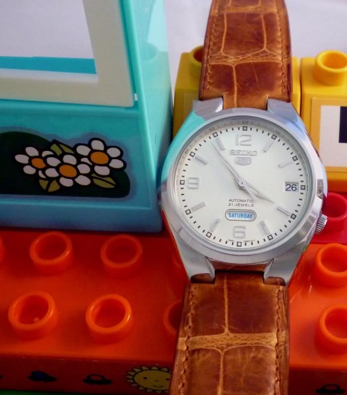Mijn horloge, een prisma quartz (sorry geen plaatje), dat ik in 1997 kreeg heeft onlangs de geest gegeven. Daarom was ik op zoek naar een nieuw horloge en kwam ik op mijn zoektocht op dit forum terecht. Het idee van een automaat beviel me wel en om dat eens te proberen heb ik een Seiko 5 model uitgekozen. Ik ben (nog?) geen verzameleaar, maar vond het wel zo netjes om na alle informatie die ik hier gelezen had wat terug te doen in de vorm van wat plaatjes van mijn nieuwe aanwinst, de Seiko SNKE63. Op dit moment nog met de standaard stalen band, maar ik wil binnenkort eens kijken hoe het lijkt met een donkerbruine of zwarte leren band.