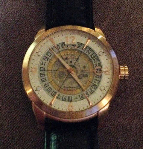 Een maand geleden kreeg ik van mijn vrouw een tweede automaat, een CCCP Sputnik 1 met Slava caliber, versie 7001-05, in rosé doublé. Duidelijk groter en zwaarder, en een kennelijk veel langzamer lopend uurwerk (3 Hz?). De nauwkeurigheid ligt in dezelfde orde van grootte als de Mondaine, misschien zelfs iets nauwkeuriger.