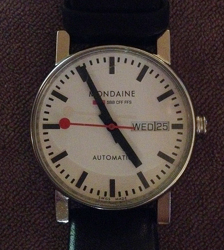 In 2007 heb ik mijn eerste gekocht, een Mondaine Automatic. Deze draag ik dagelijks. Zo langzamerhand zitten er wat gebruiksspoortjes op en heb ik inmiddels het derde bandje (louter origineel, uiteraard). Het ETA caliber (2436 met aanpassingen) is, naar ik me heb laten vertellen, een 5Hz exemplaar. Nauwkeurigheid zit binnen 10 seconden afwijking per etmaal.