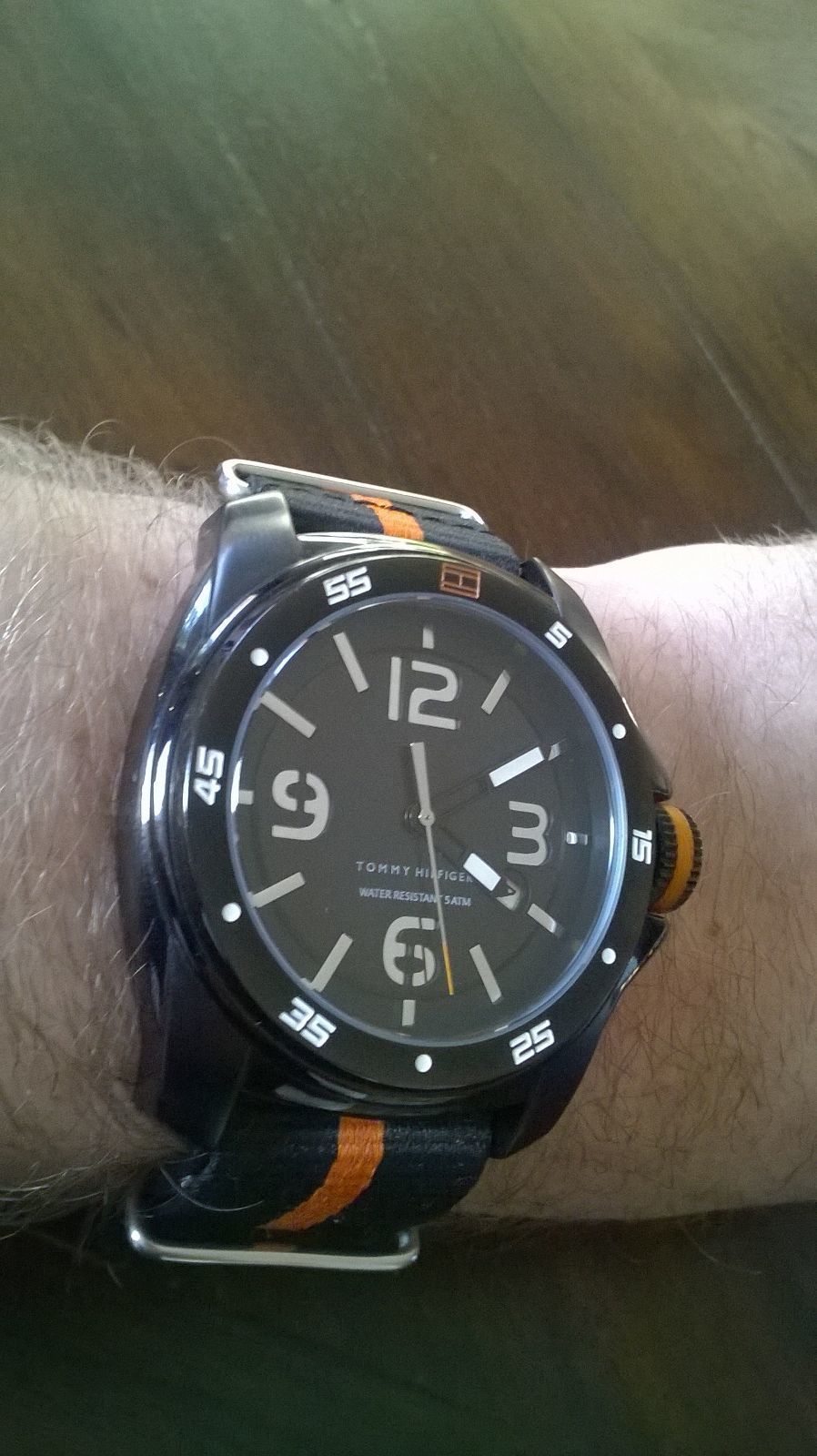 Een Tommy Hilfiger surf watch, ja een modeklok, lekker horloge on Te dragen. Droeg hem eerst met de originele olijfgroene siliconenband en nu op een NATO en dat bevalt me wel moet ik zeggen.