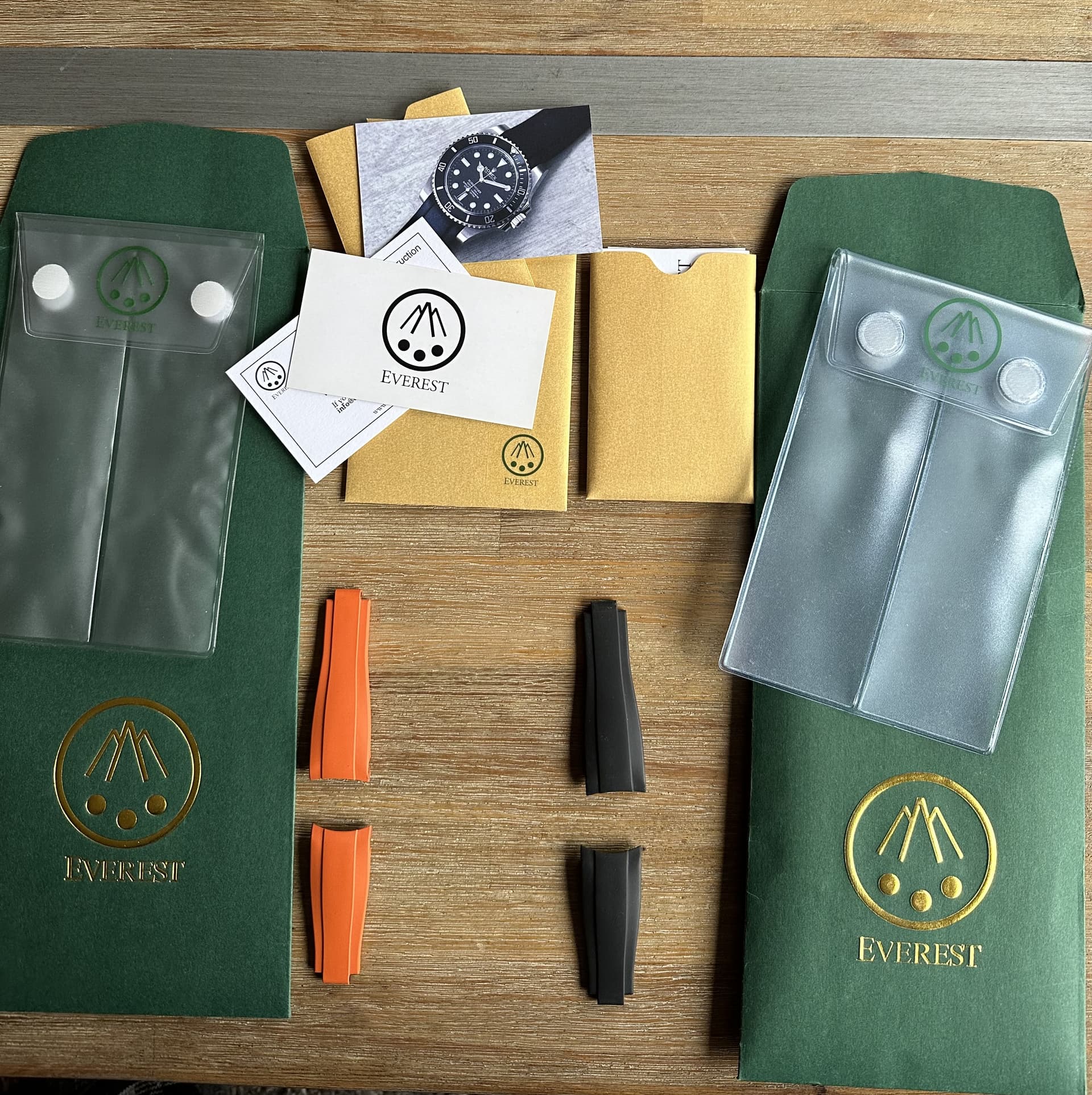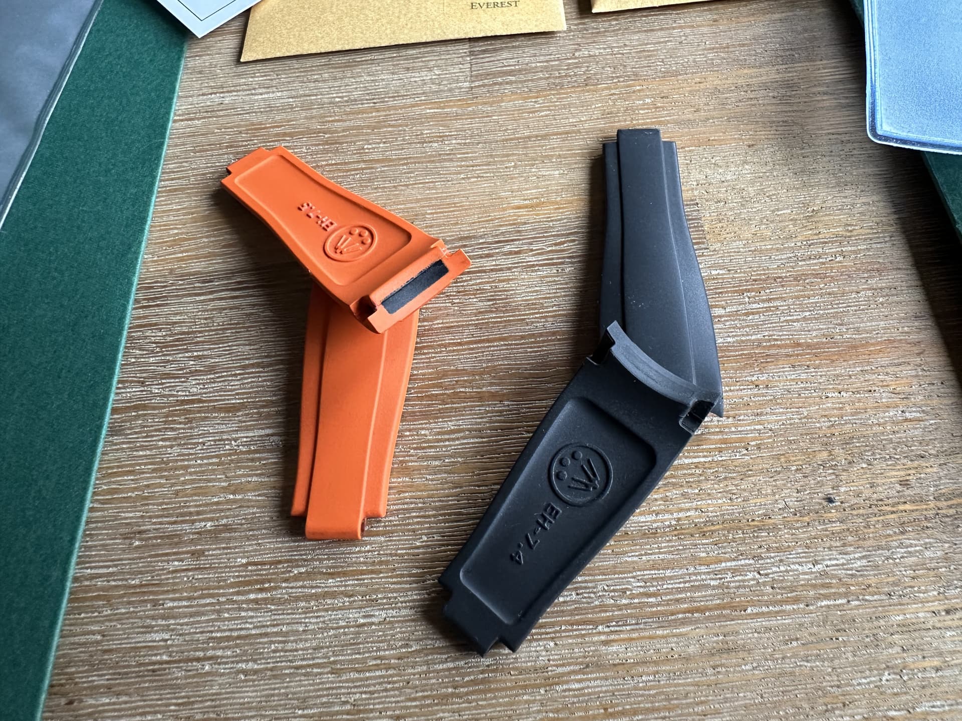 Te koop: twee rubberen Everest horloge banden voor o.a. Rolex Submariner 114060 en GMT Master II. Een zwarte en een oranje variant van 4 en 5 links. Je kunt dus de sluiting van de originele band gebruiken.