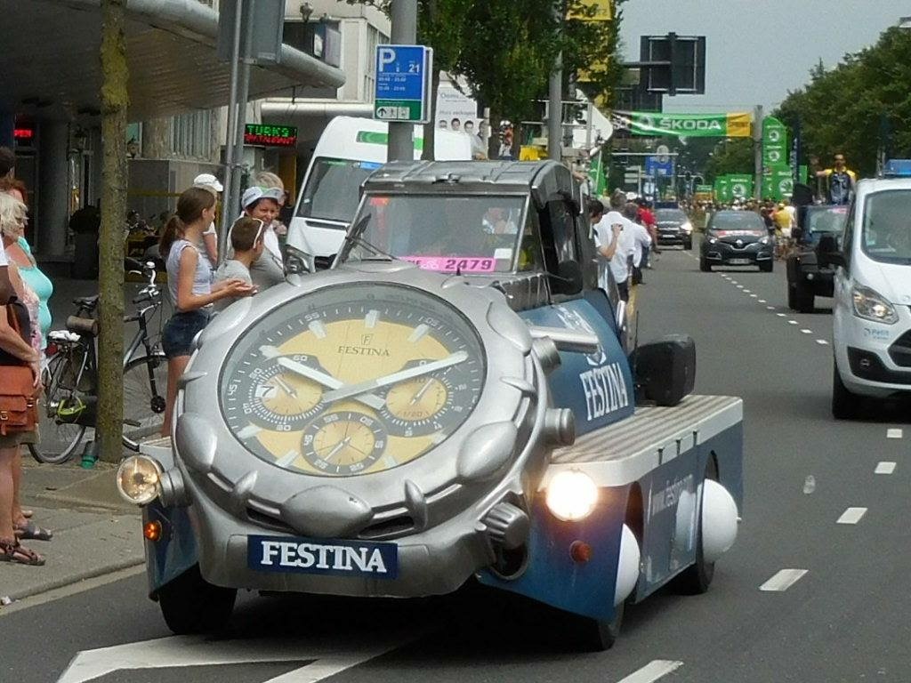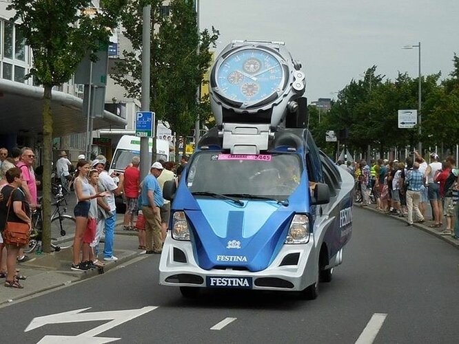 Die horloges op de auto lijken in ieder geval in geen enkel detail op de Tour editie van dit jaar. Wat ik overigens best een mooi horloge vind, met de mooie details bij onder andere de chrono pushers en de band.