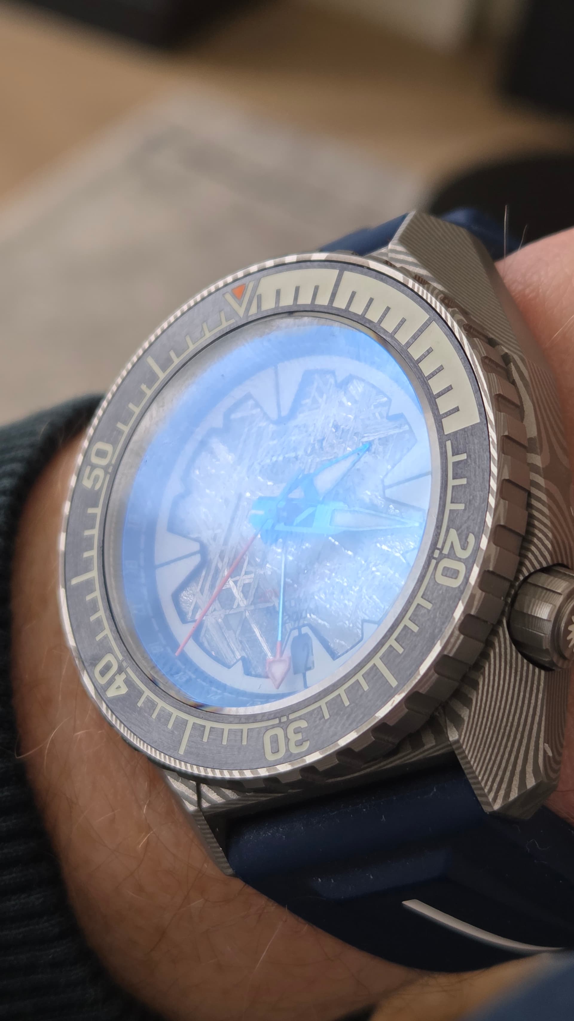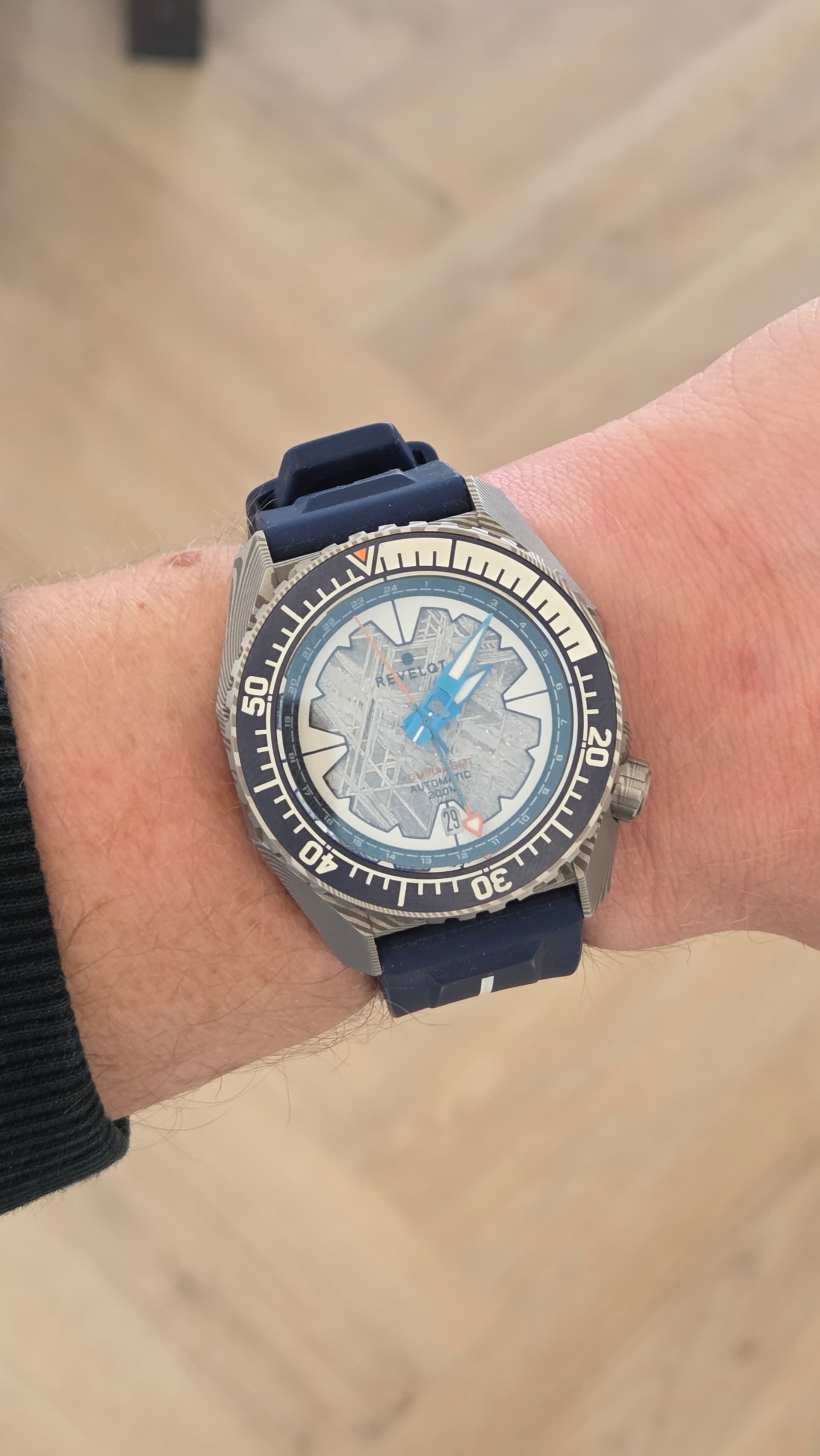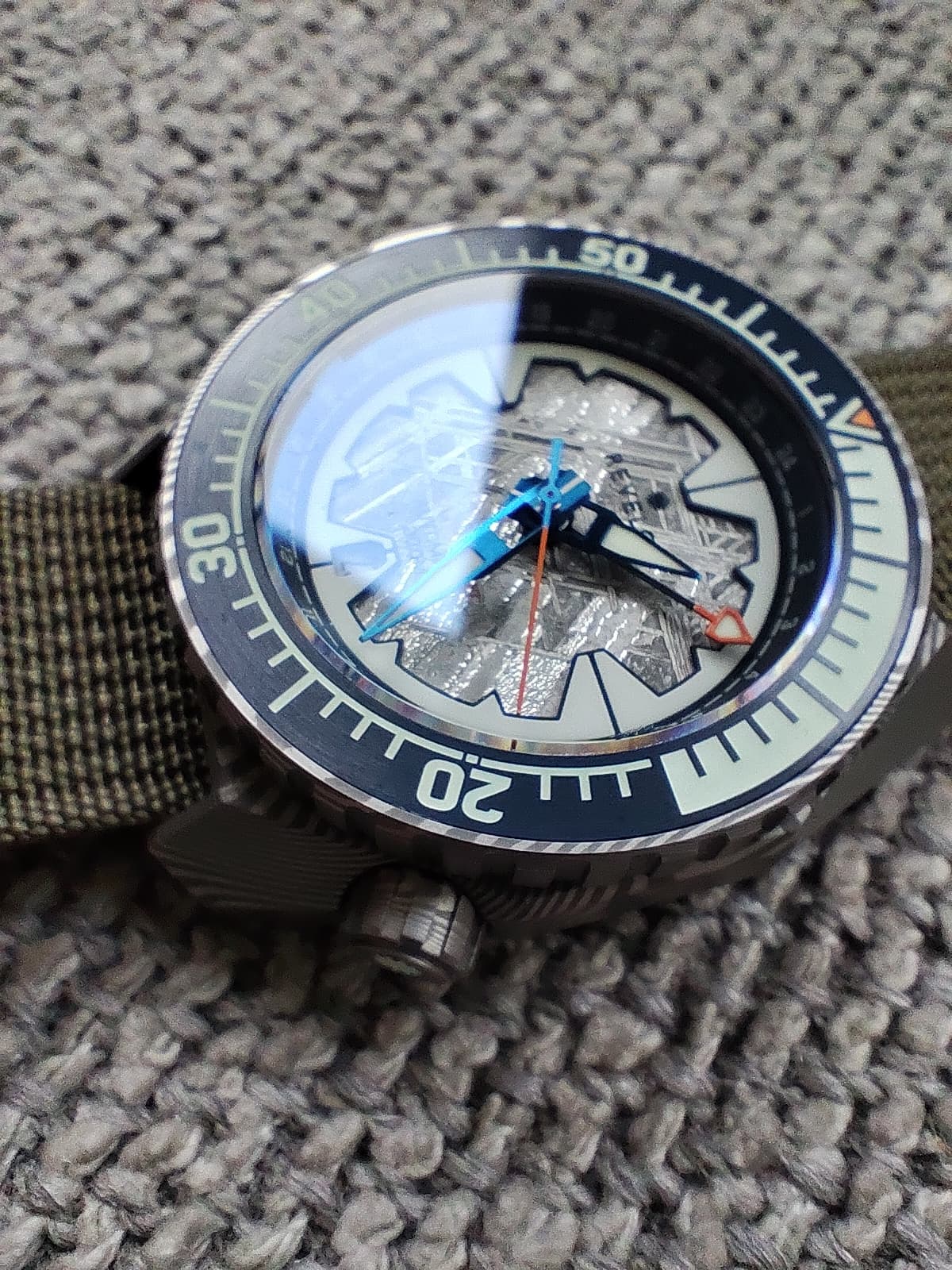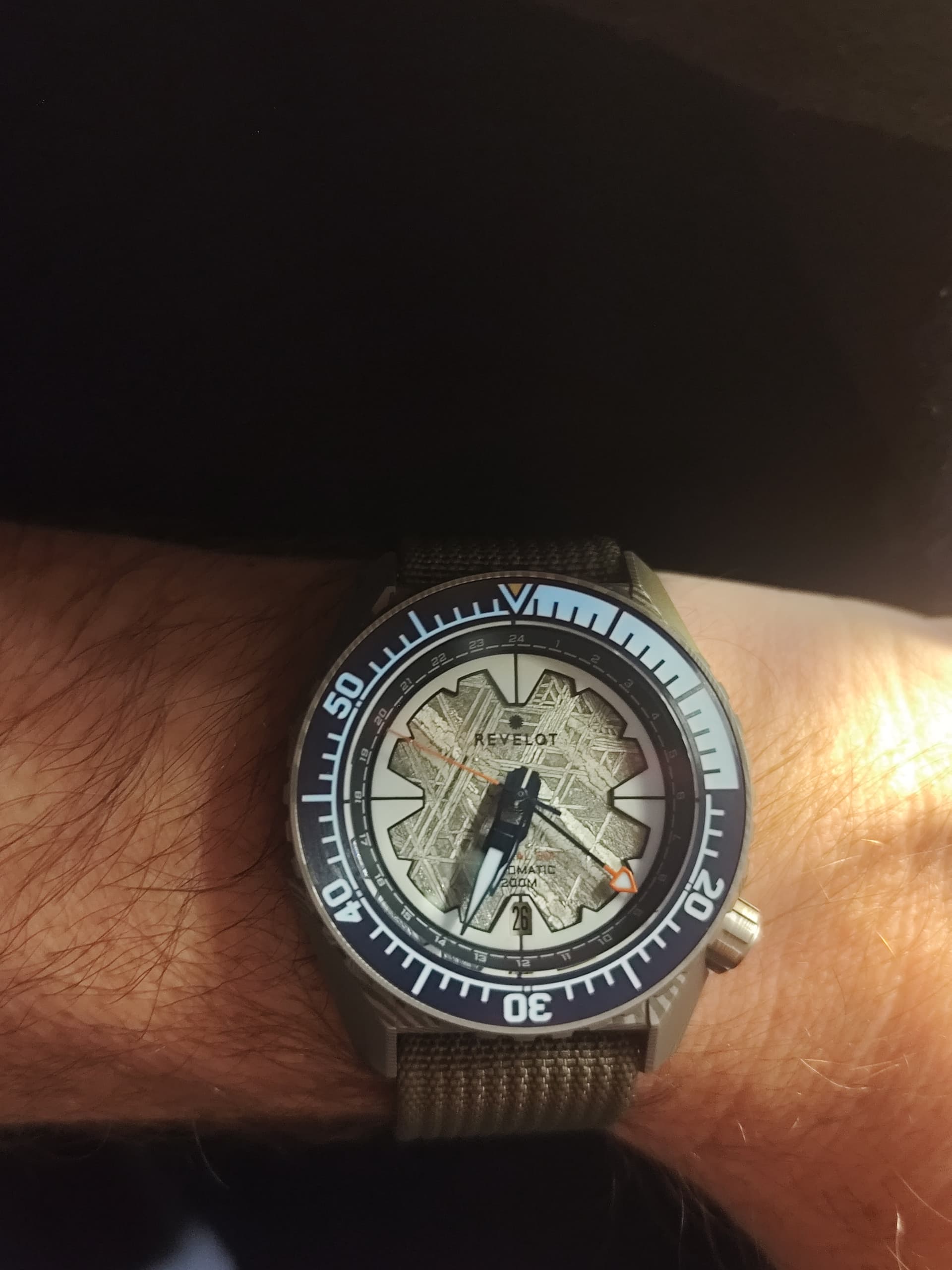 Zijn er dan ook zaken ter positieve opgevallen? Absoluut wel! Ik heb geen vergelijkingsmateriaal, maar ik vind deze meteorieten wijzerplaat echt prachtig! De extra lume ring doet daar dan weer wat tekort aan, maar die past natuurlijk wel in het verhaal van het horloge.