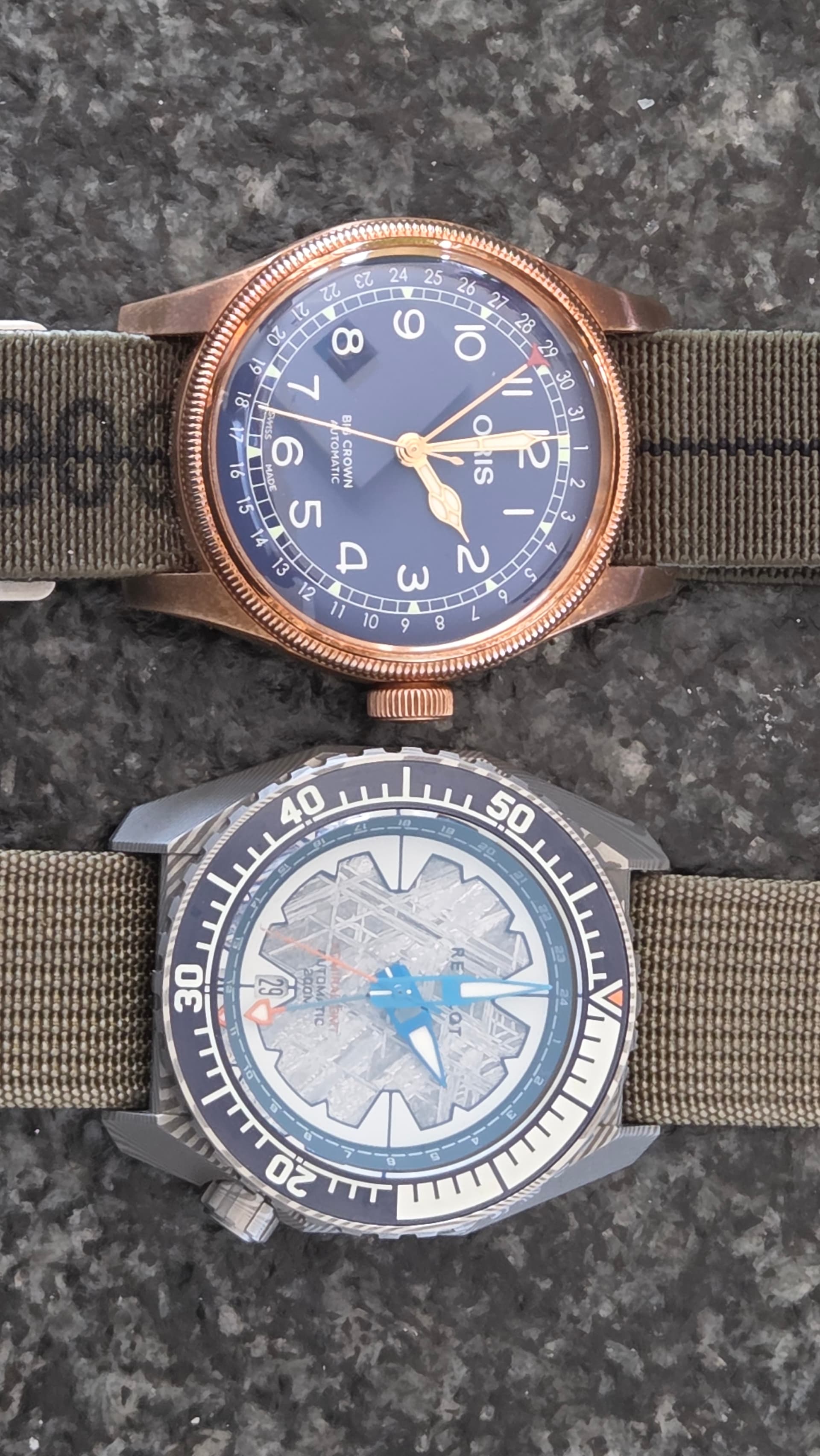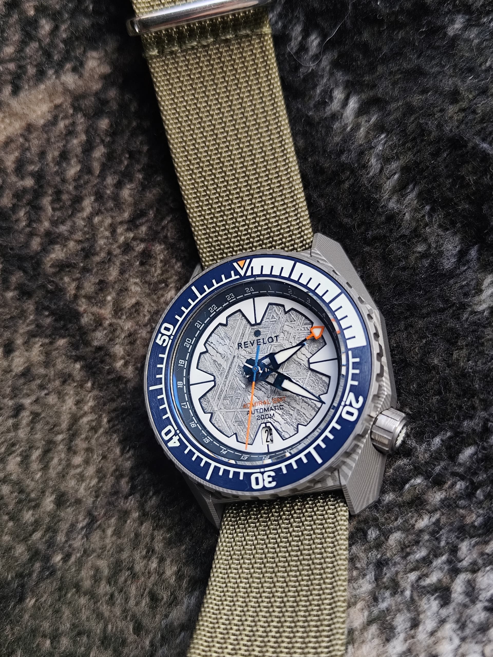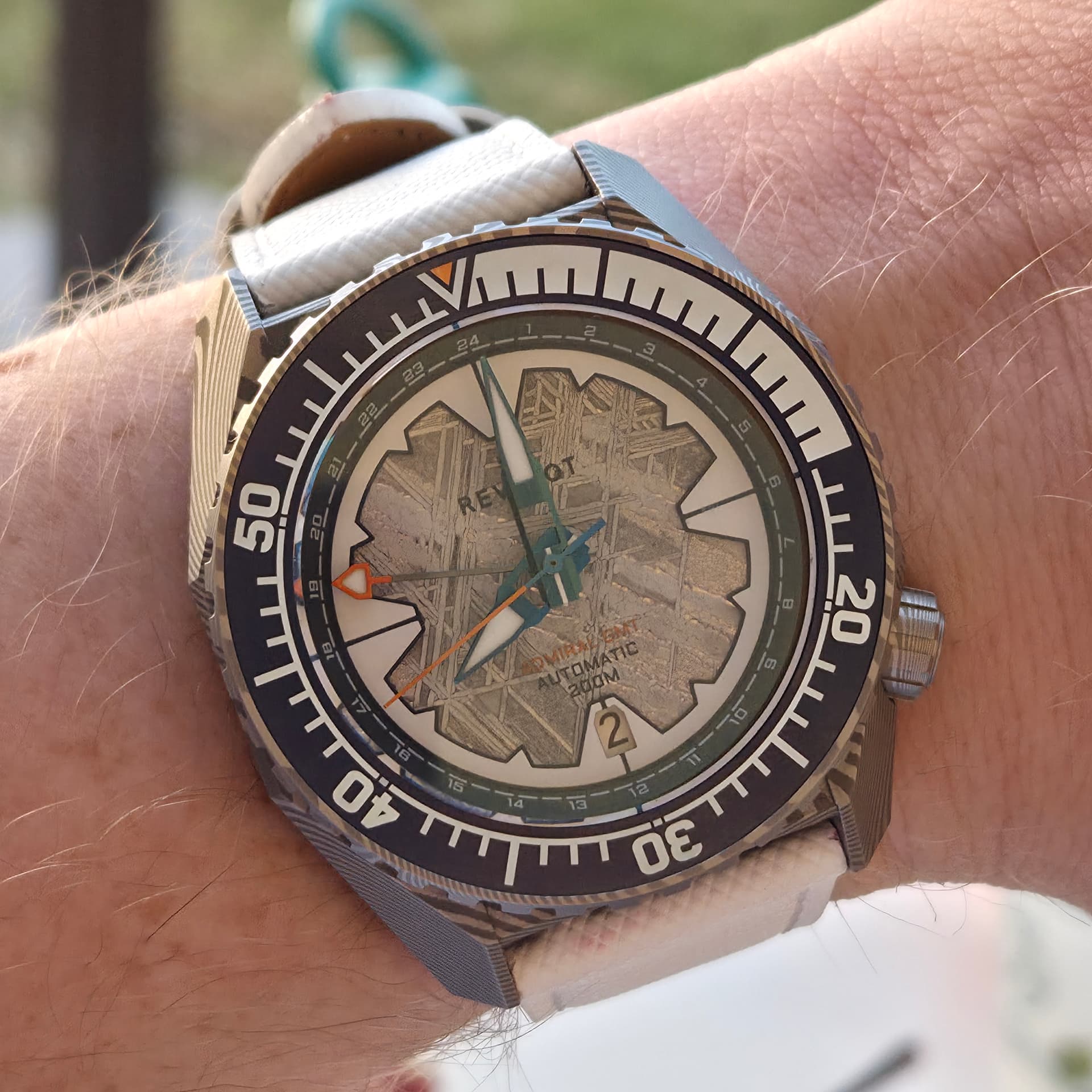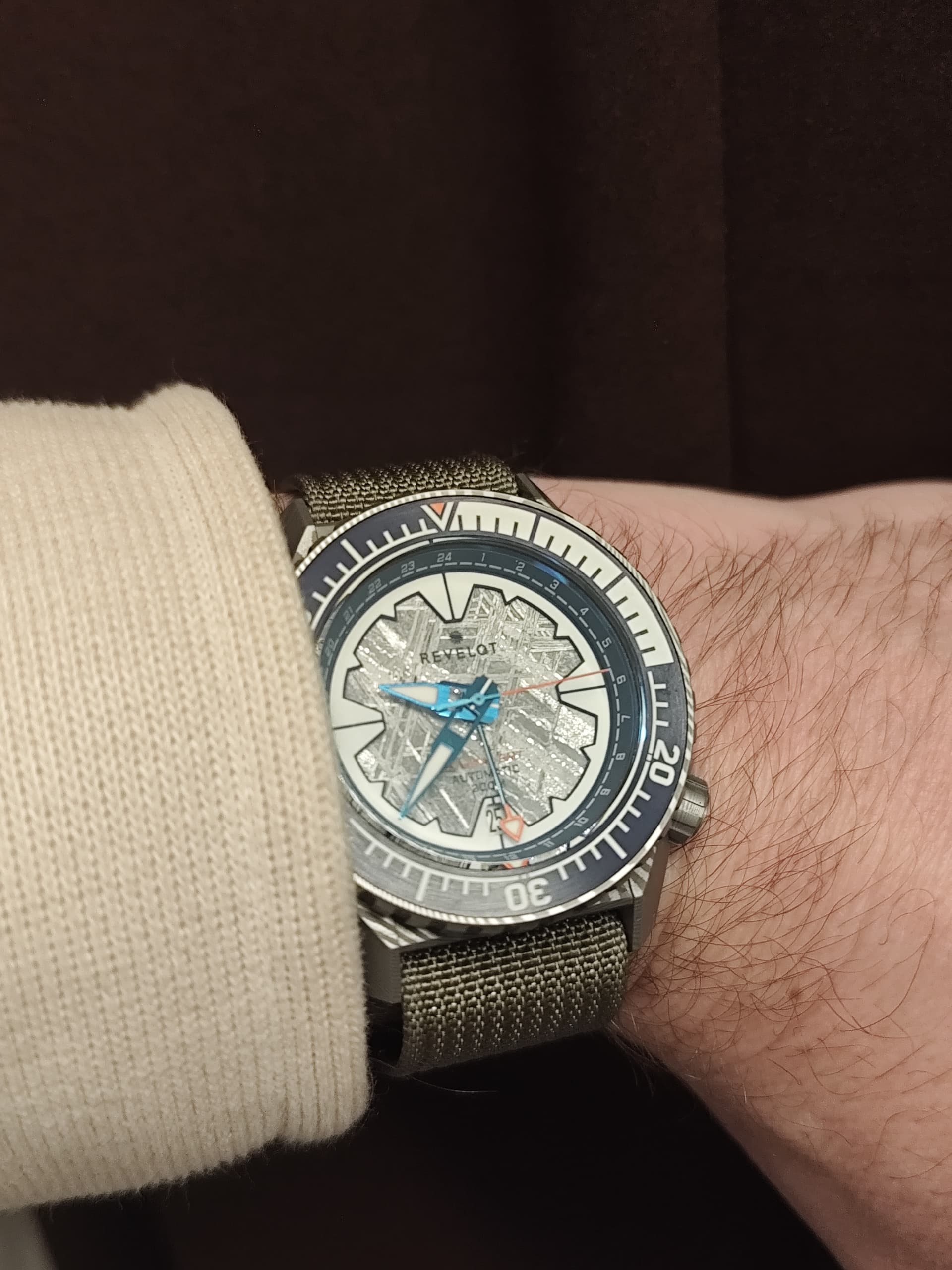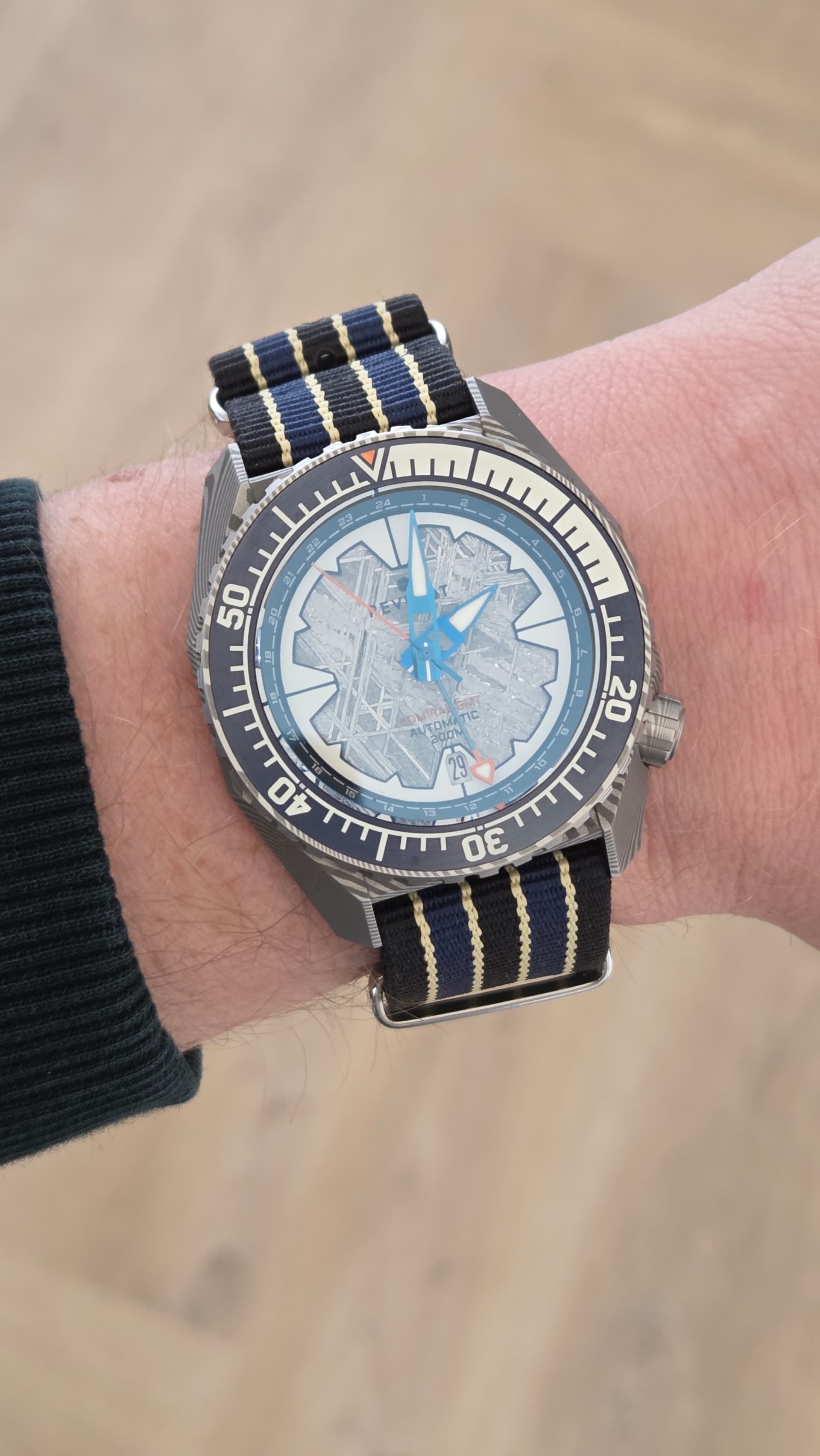 Zijn er dan ook zaken ter positieve opgevallen? Absoluut wel! Ik heb geen vergelijkingsmateriaal, maar ik vind deze meteorieten wijzerplaat echt prachtig! De extra lume ring doet daar dan weer wat tekort aan, maar die past natuurlijk wel in het verhaal van het horloge.