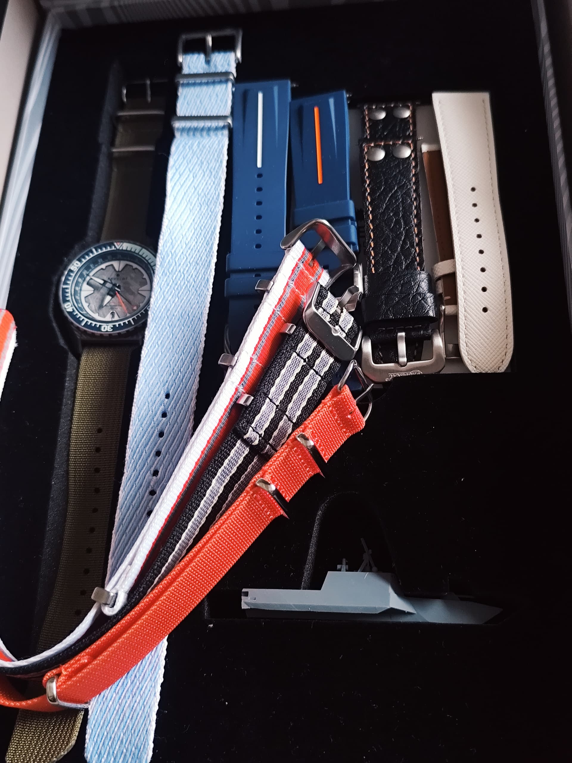 Op een van de foto’s zit een blauw/zwart/wit Nato-bandje, die gaat mee naar de volgende eigenaars. Meer 22mm heb ik überhaupt niet rondslingeren.