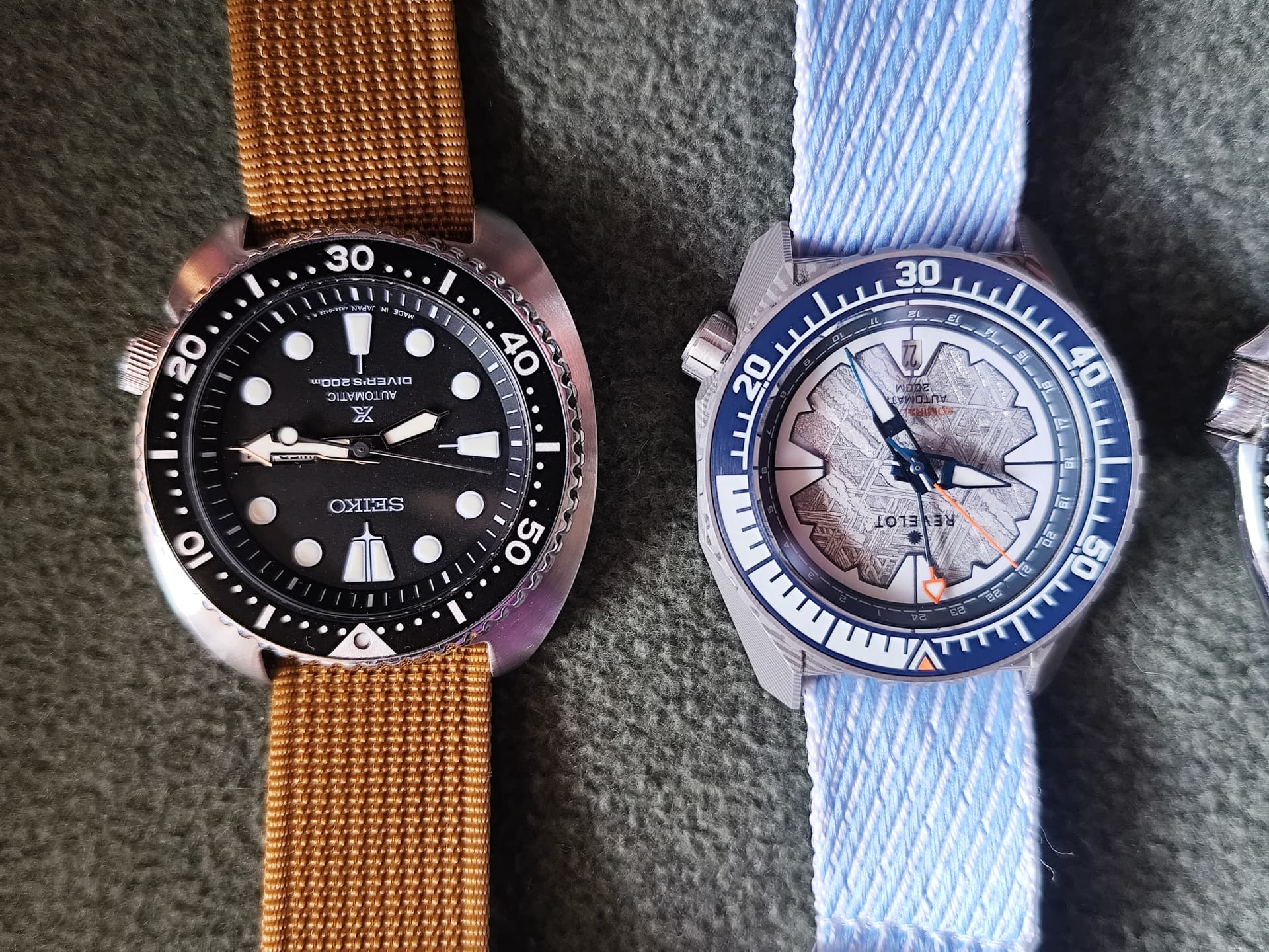 Die vorm, deze tussenweg tussen de “gewone” lugs van de SKX en de brede Turtle lugs zorgen ervoor dat de relatief zware duiker mooi stabiel op de pols ligt en niet zwaar aanvoelt als je hem draagt (wel los in de hand, in vergelijking tot de Pelagos 42mm). Alle genoemde duikers hebben 22mm lugbreedte. De Turtle draagt veel kleiner dan je op basis van de diameter zou verwachten en dat geldt dus ook voor deze Revelot.
