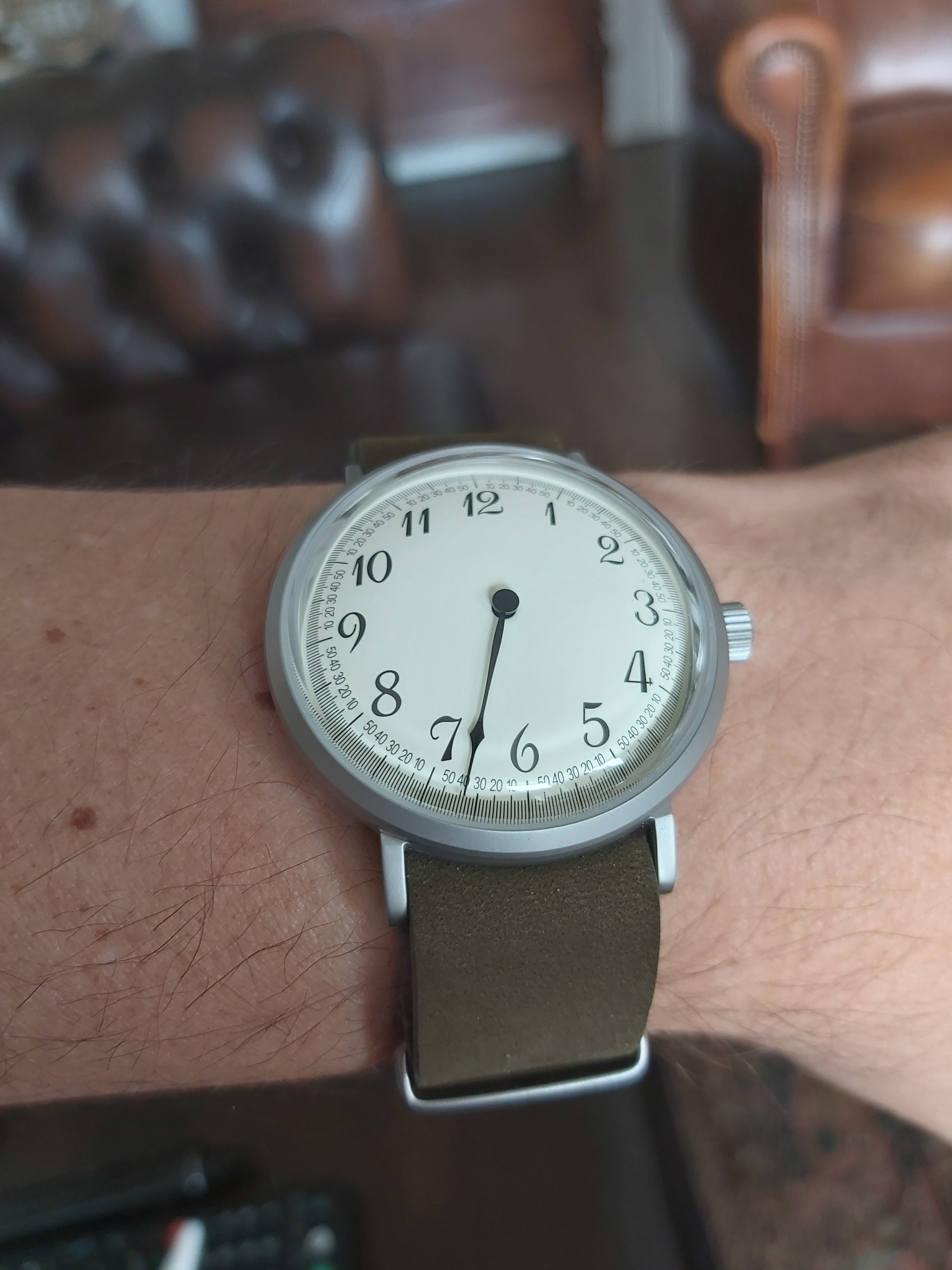 Een kale witte wijzerplaat en de matte kast in lichte metaalkleur helpen ook niet echt en daarmee een vreemd horloge en een vreemde eend in mijn horlogedoos de afgelopen week!