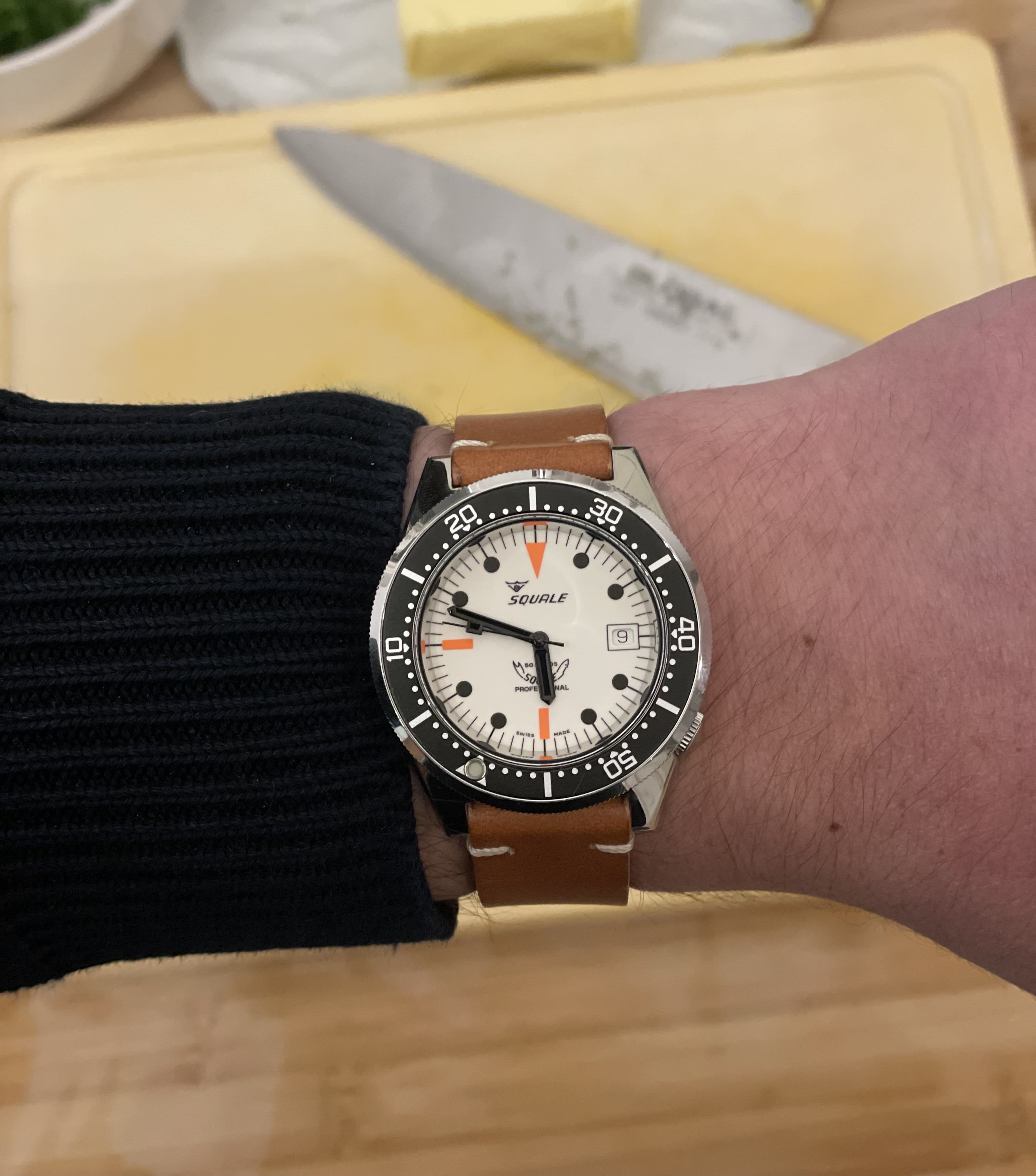 Toch is de lederen band blijven zitten, misschien is een duiker op leer toch niet zo verkeerd? Het horloge wordt er in ieder geval iets chiquer van. De combinatie volledig wit uitgevoerde luminescerende wijzerplaat, oranje accenten i.c.m. ’n nato achtige band maakt hem in mijn ogen iets te “goedkoop”.