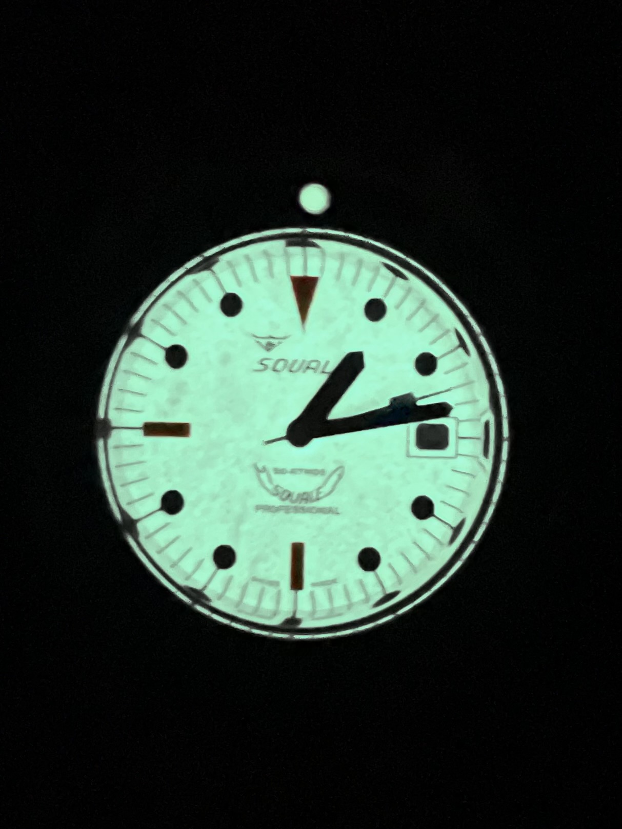 Een kleine dertig jaar later zijn dino’s helaas geen groot deel meer van mijn belevingswereld en ik ben - ondanks mijn dromen van toen - nooit sterrenkundige geworden. Maar! Maar. Glow in the dark is nog steeds heel cool. We noemen dat tegenwoordig alleen “Lume” en dat moet je heel serieus nemen als je een beetje horlogedork bent. Dat weten ze bij Squale ook: vandaar dat ze de 50 Atmos in de kenmerkende 1521-kast ook uitleveren met een volledig ondergelumede wijzerplaat.