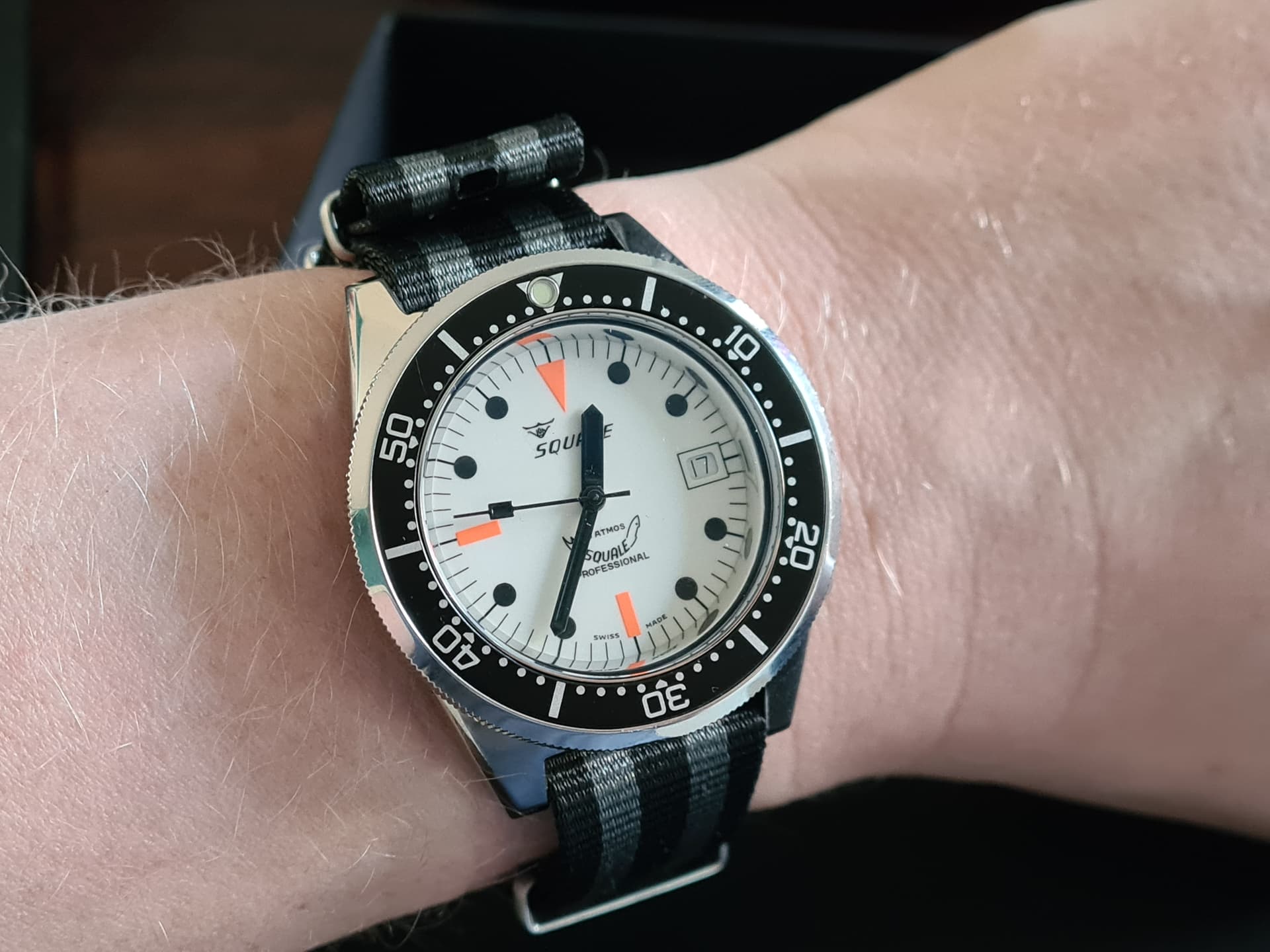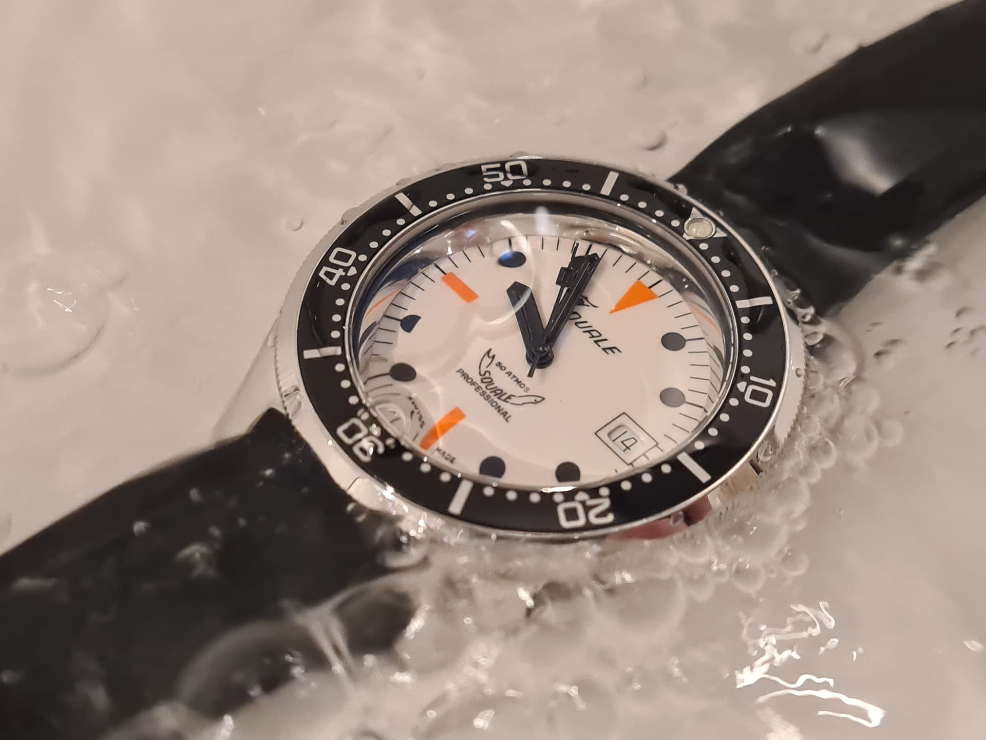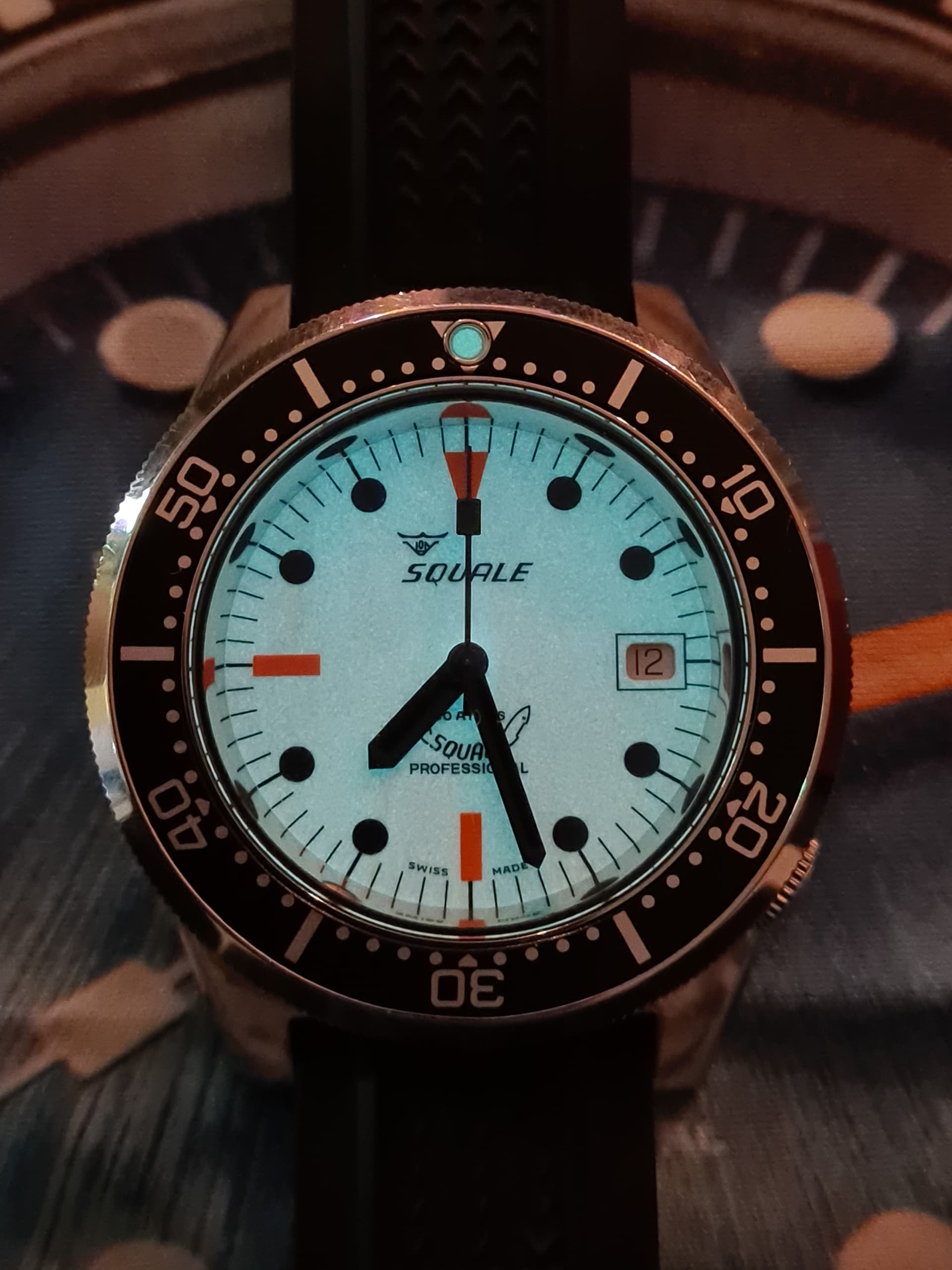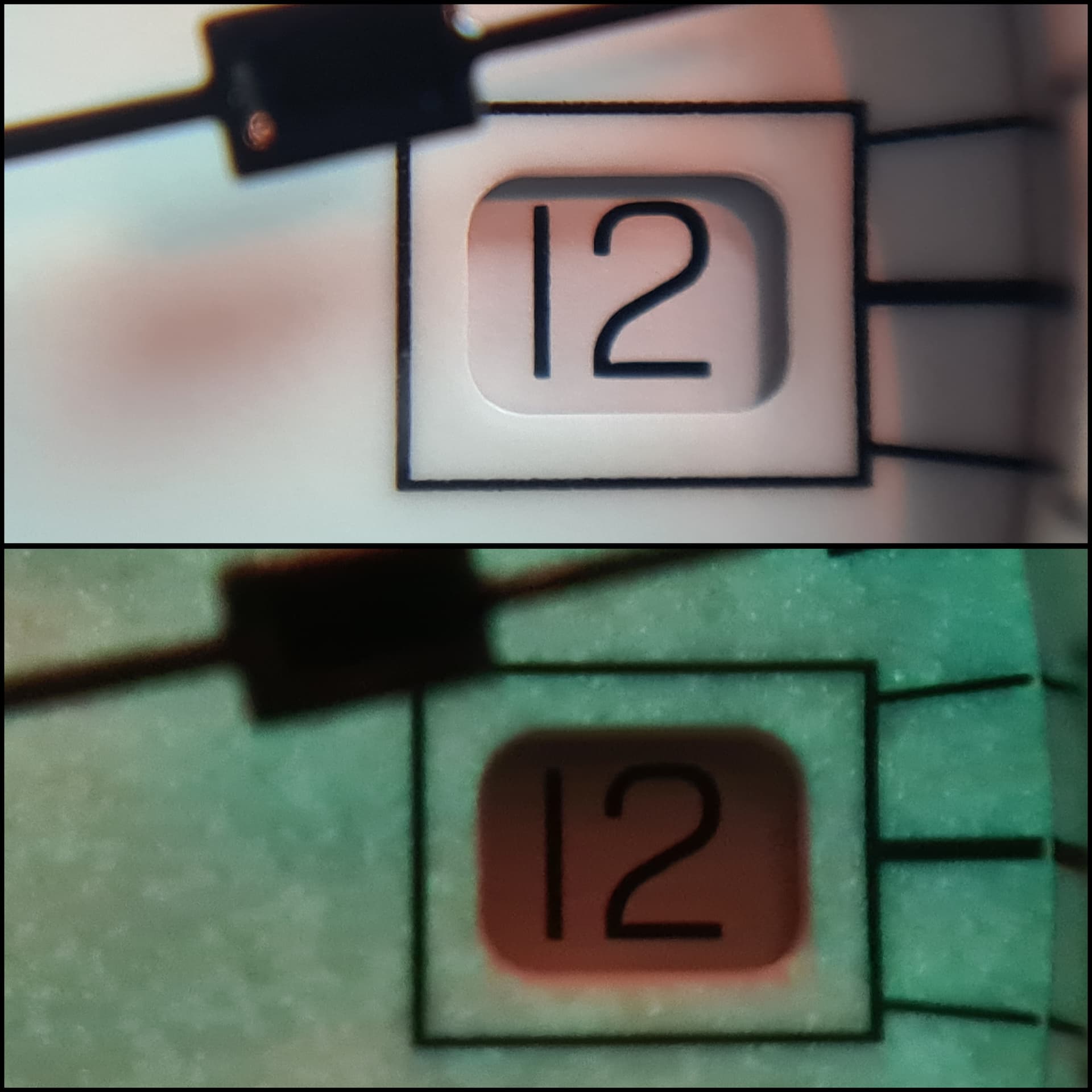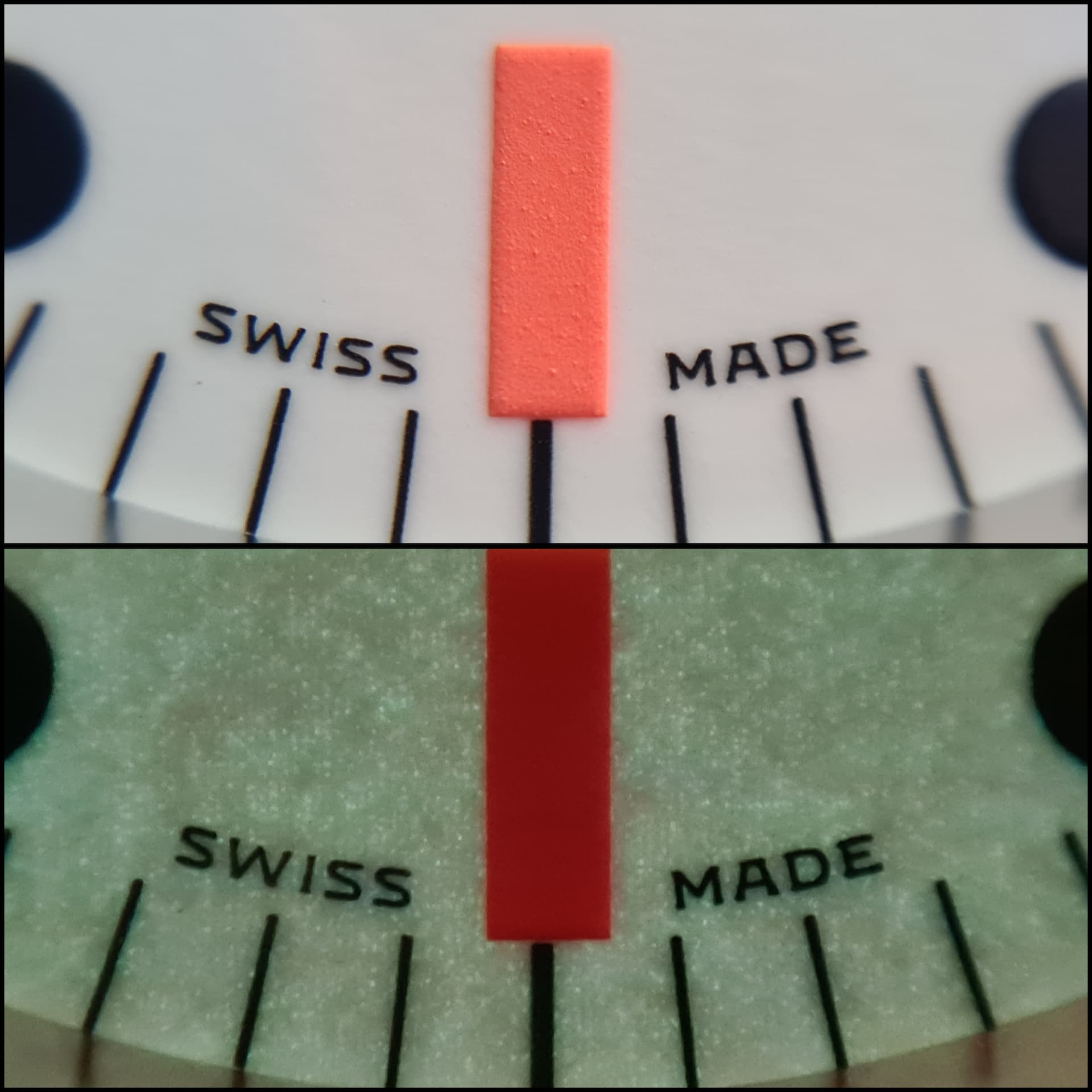 De oplichtende dial is echt heel cool en van dichtbij is goed te zien dat het niet perse een egaal laagje lijkt te zijn. Daarnaast lijkt het op de ene foto meer groen en op de andere meer blauw
