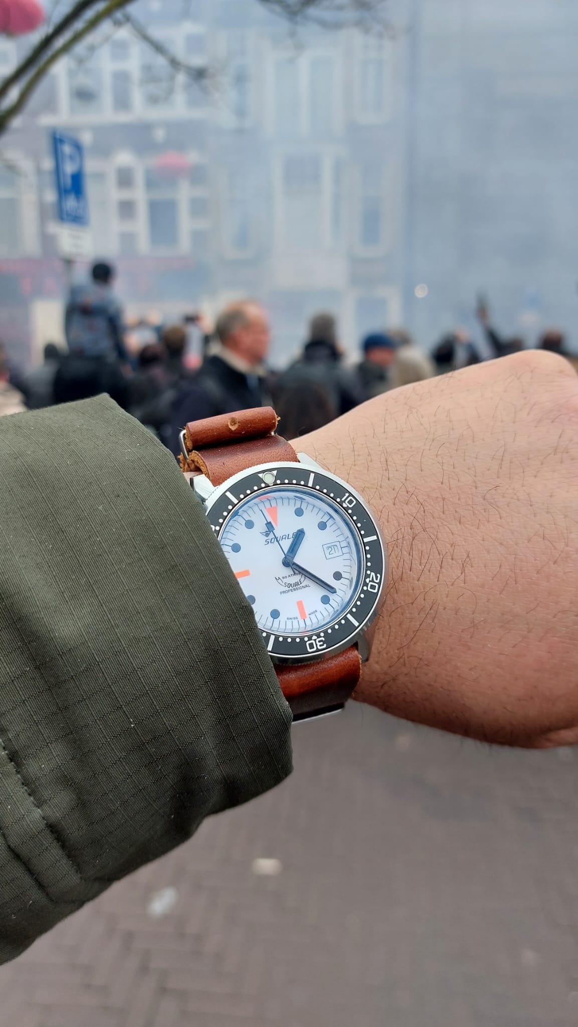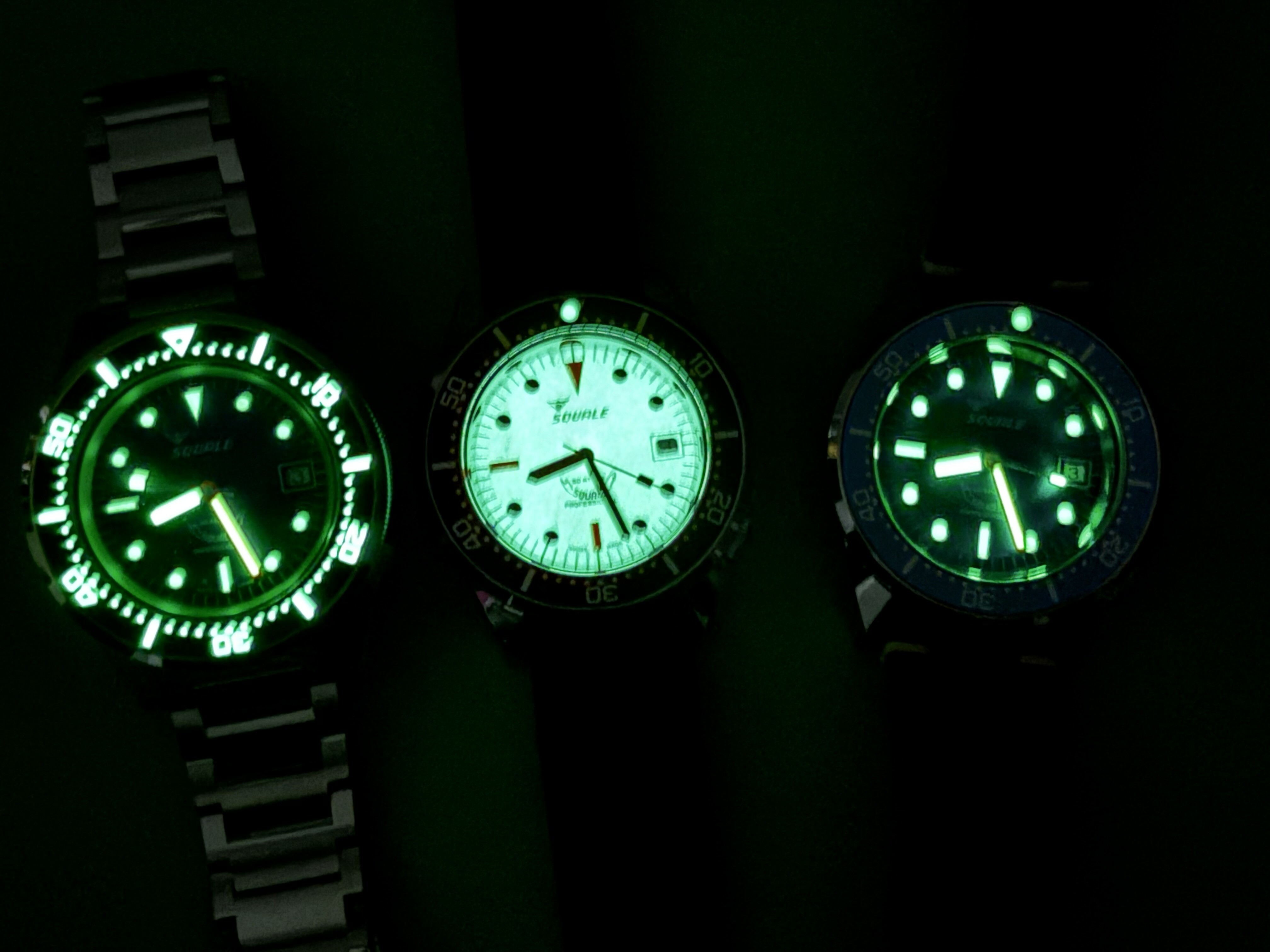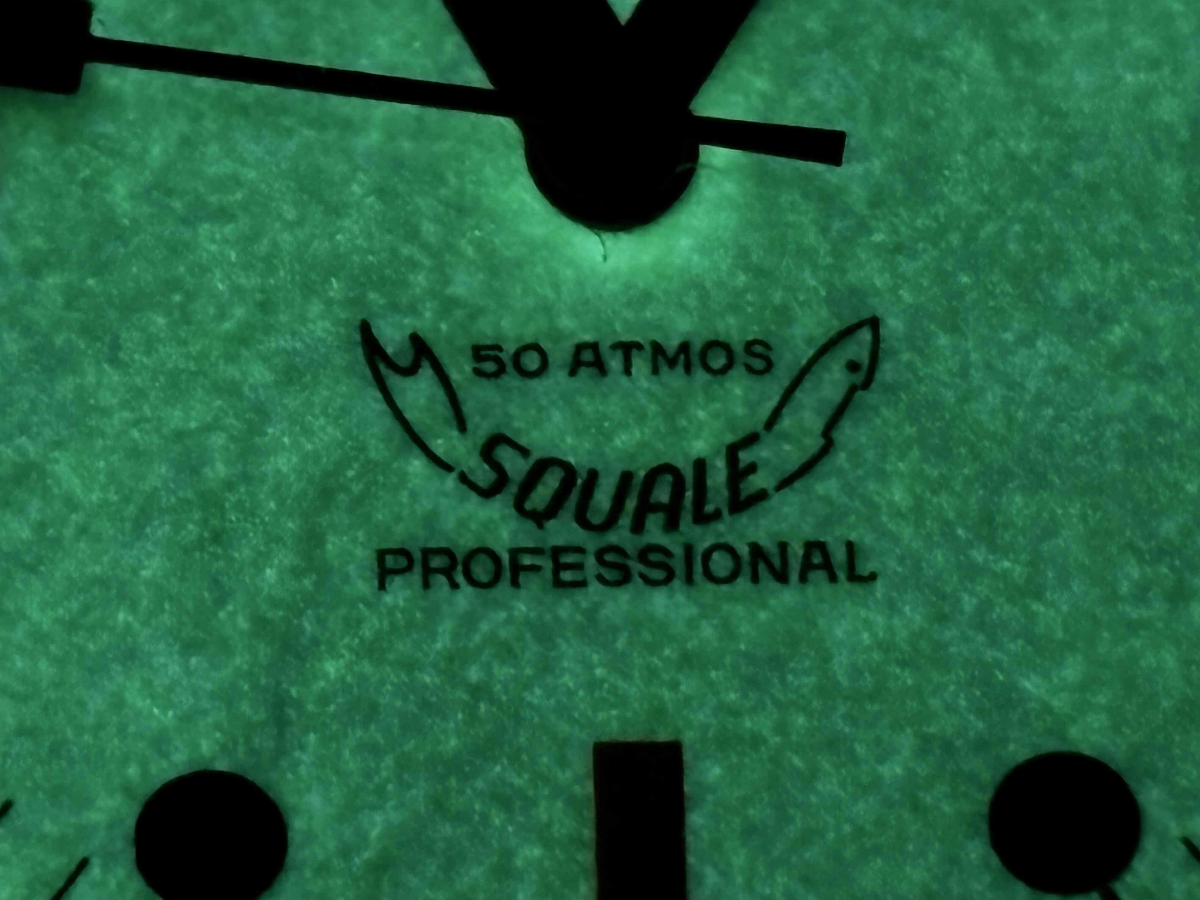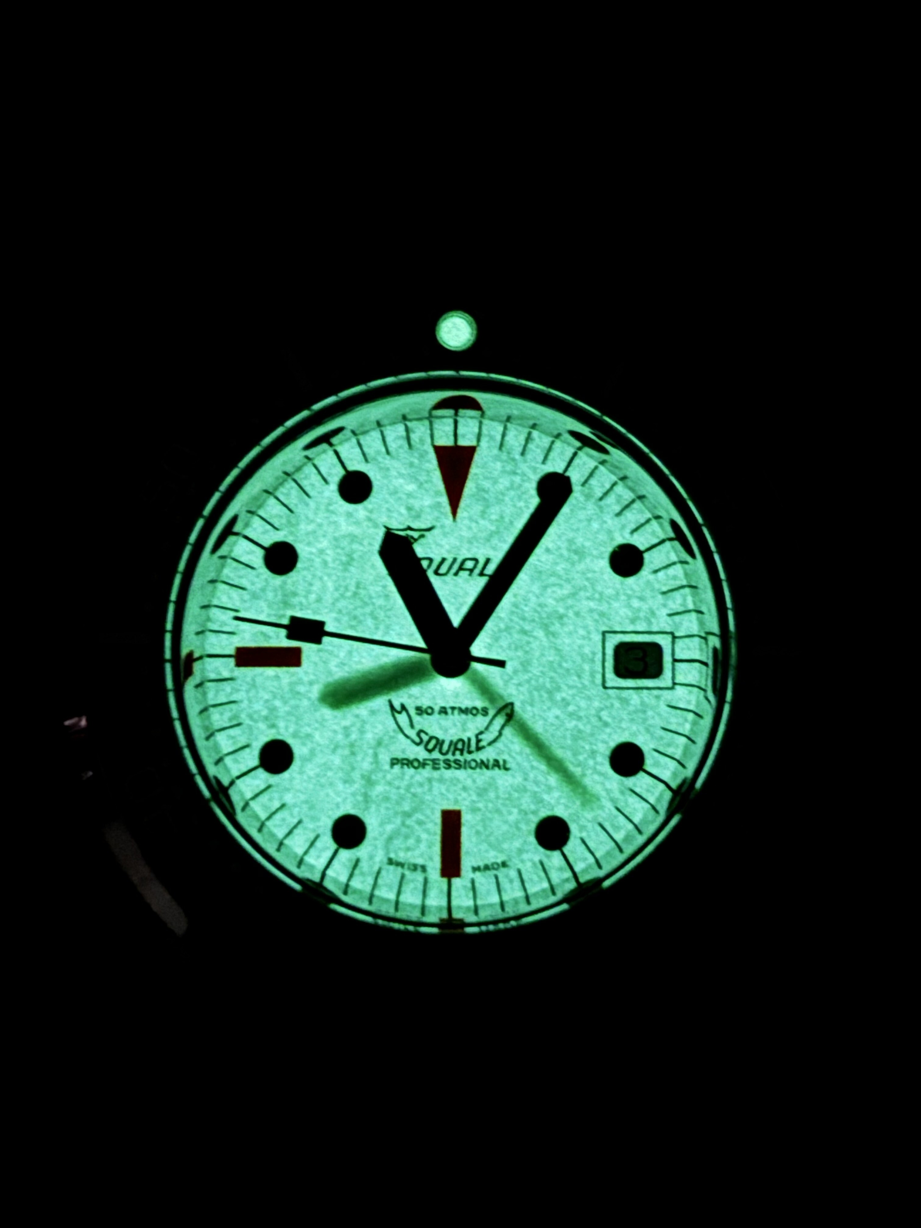 Ik denk dat ik wat meer onder de indruk was geweest als ik niet al 2 dezelfde horloges in bezit had met een echt levendige wijzerplaat, maar acht de kans toch groot dat de full lume uitvoering nog eens in de verzameling komt… maar aan de andere kant zo’n titanium Master is ook wel iets bijzonders of een Matic of of of of zooooveel keuze, misschien wordt het wel ooit een heel Squale museum ![]()
