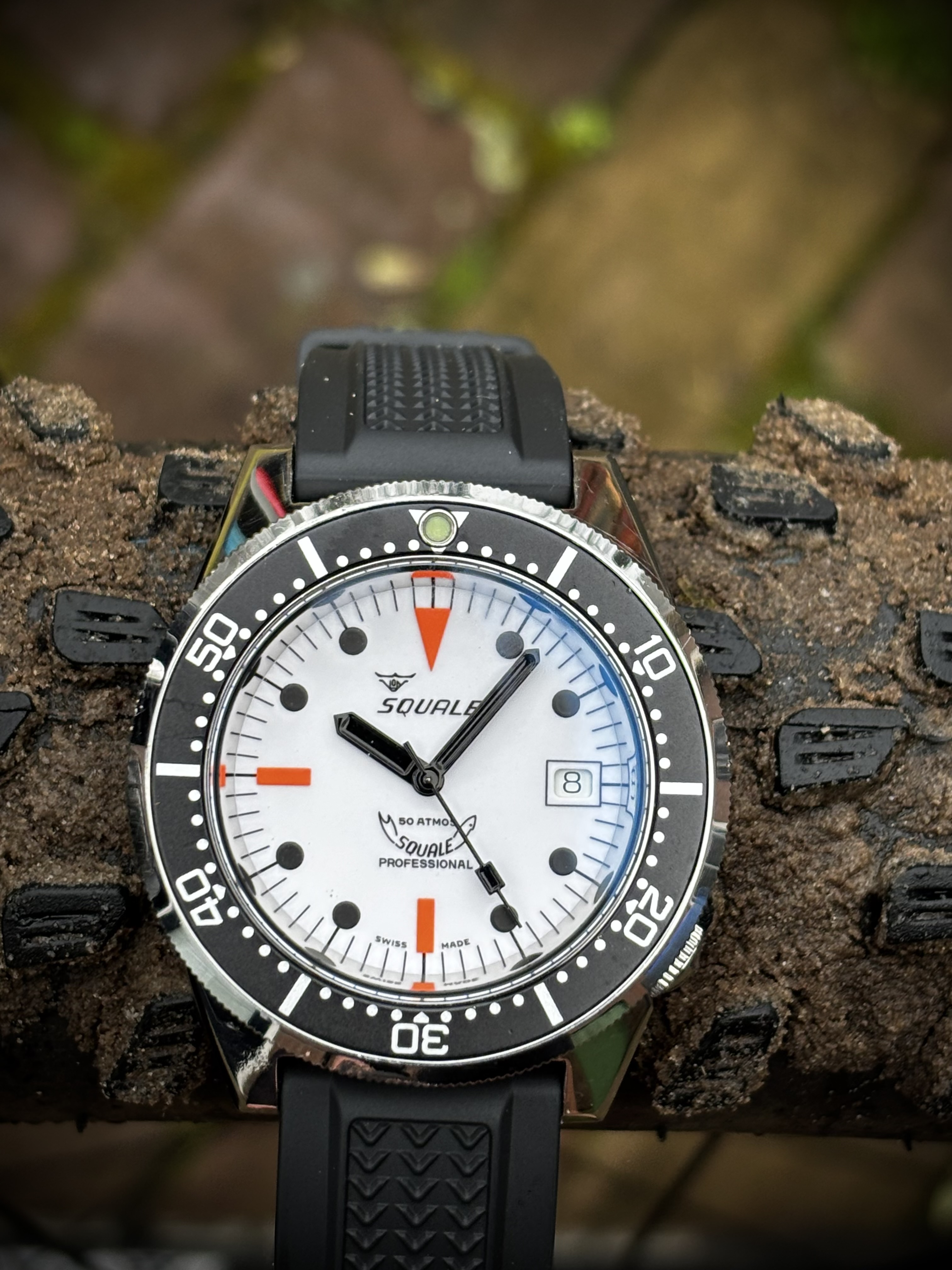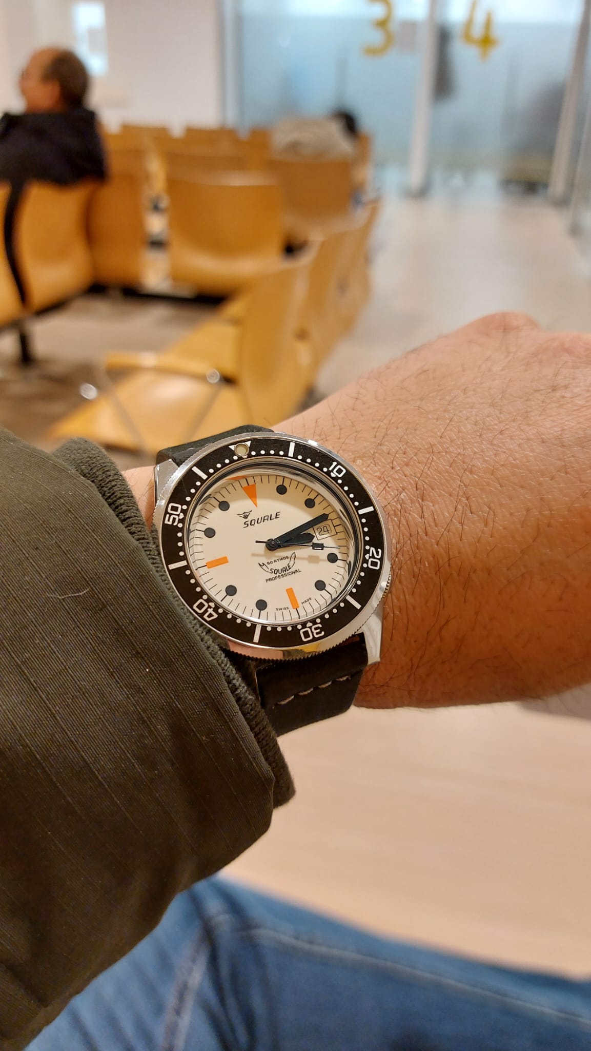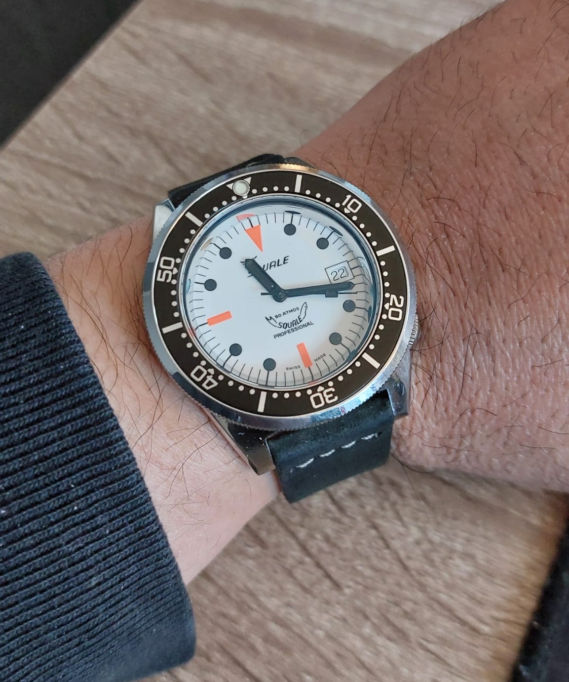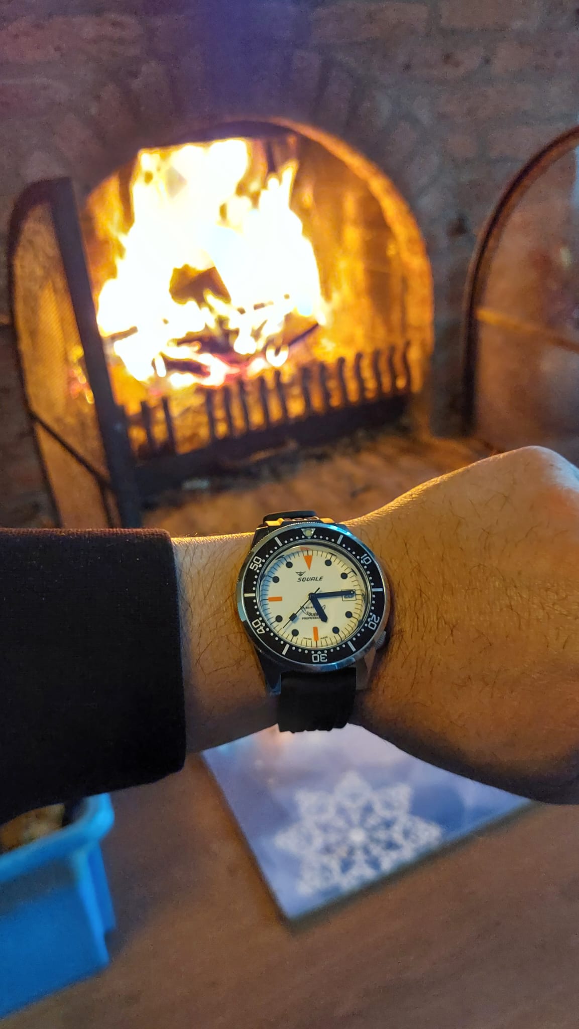 Ik denk dat ik wat meer onder de indruk was geweest als ik niet al 2 dezelfde horloges in bezit had met een echt levendige wijzerplaat, maar acht de kans toch groot dat de full lume uitvoering nog eens in de verzameling komt… maar aan de andere kant zo’n titanium Master is ook wel iets bijzonders of een Matic of of of of zooooveel keuze, misschien wordt het wel ooit een heel Squale museum ![]()